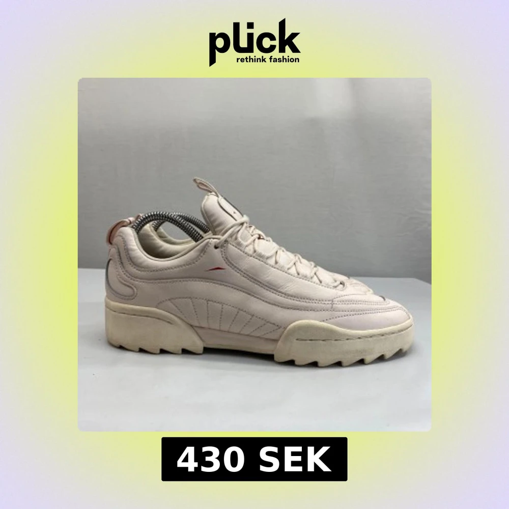 Säljer ett par beige sneakers från Reebok med riktigt chunky och räfflad sula. Skorna har snygga sömdetaljer, diskreta röda inslag och snörning framtill. Ovandelen är i skinn och har en modern, sportig vibe som sticker ut.