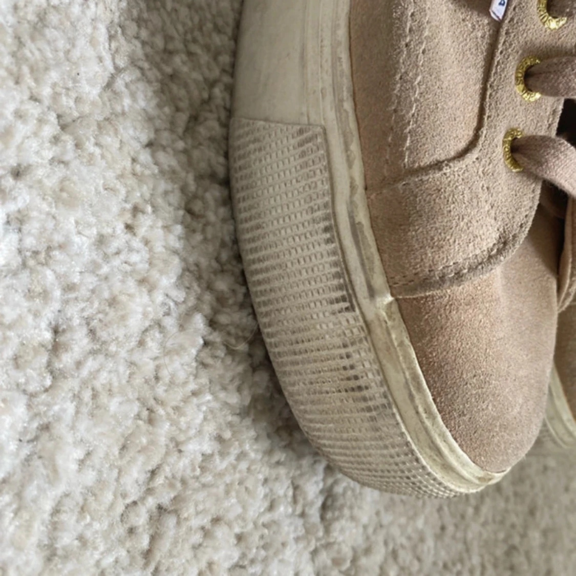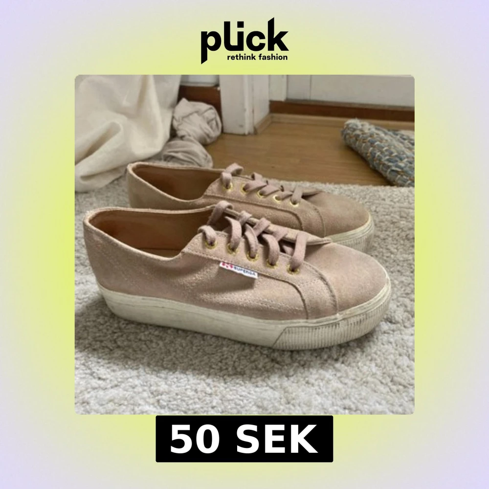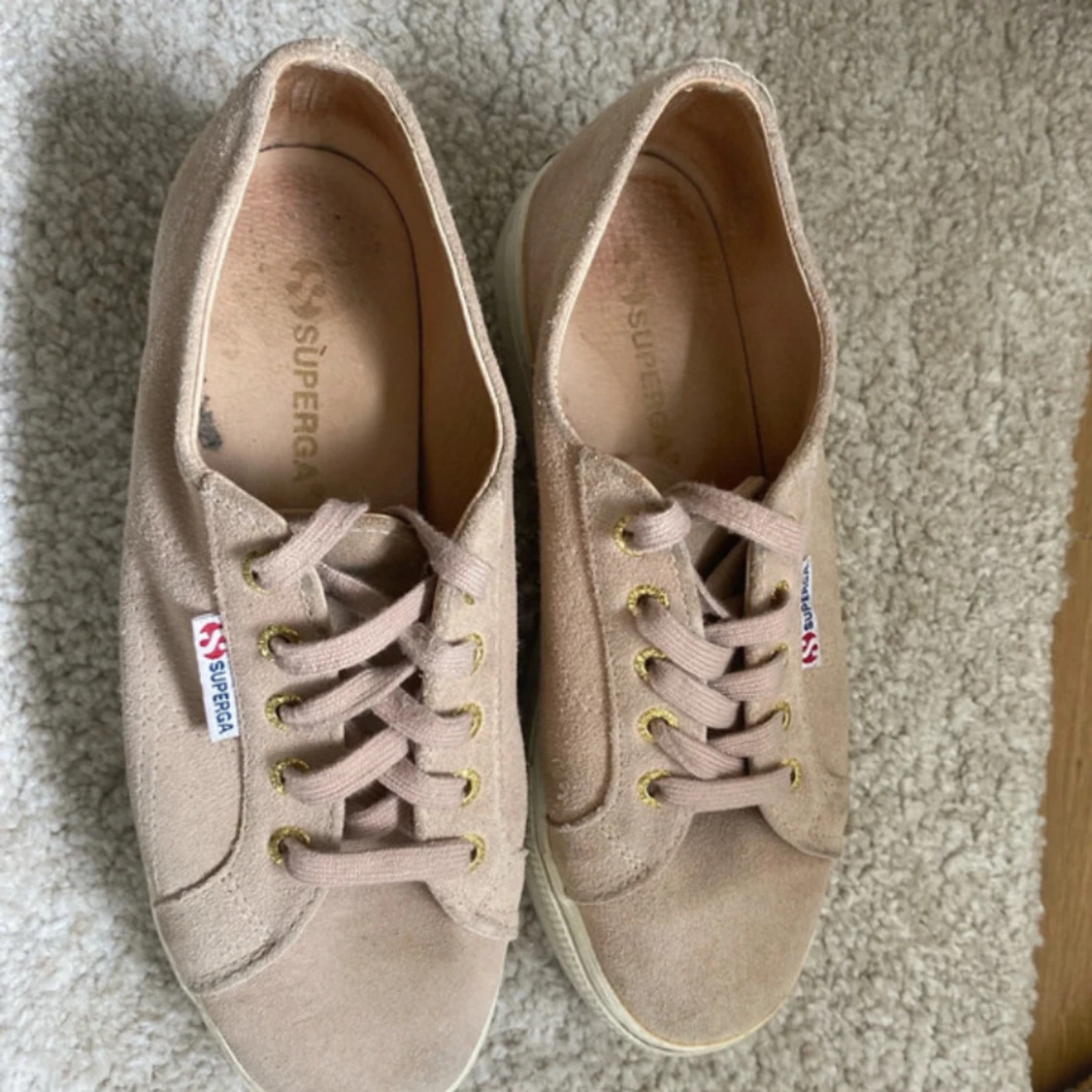 Säljer ett par beigea Superga sneakers i mocka med platåsula. Skorna har snörning med guldfärgade öljetter och en klassisk Superga-logga på sidan. Perfekta för dig som gillar en stilren och enkel look.