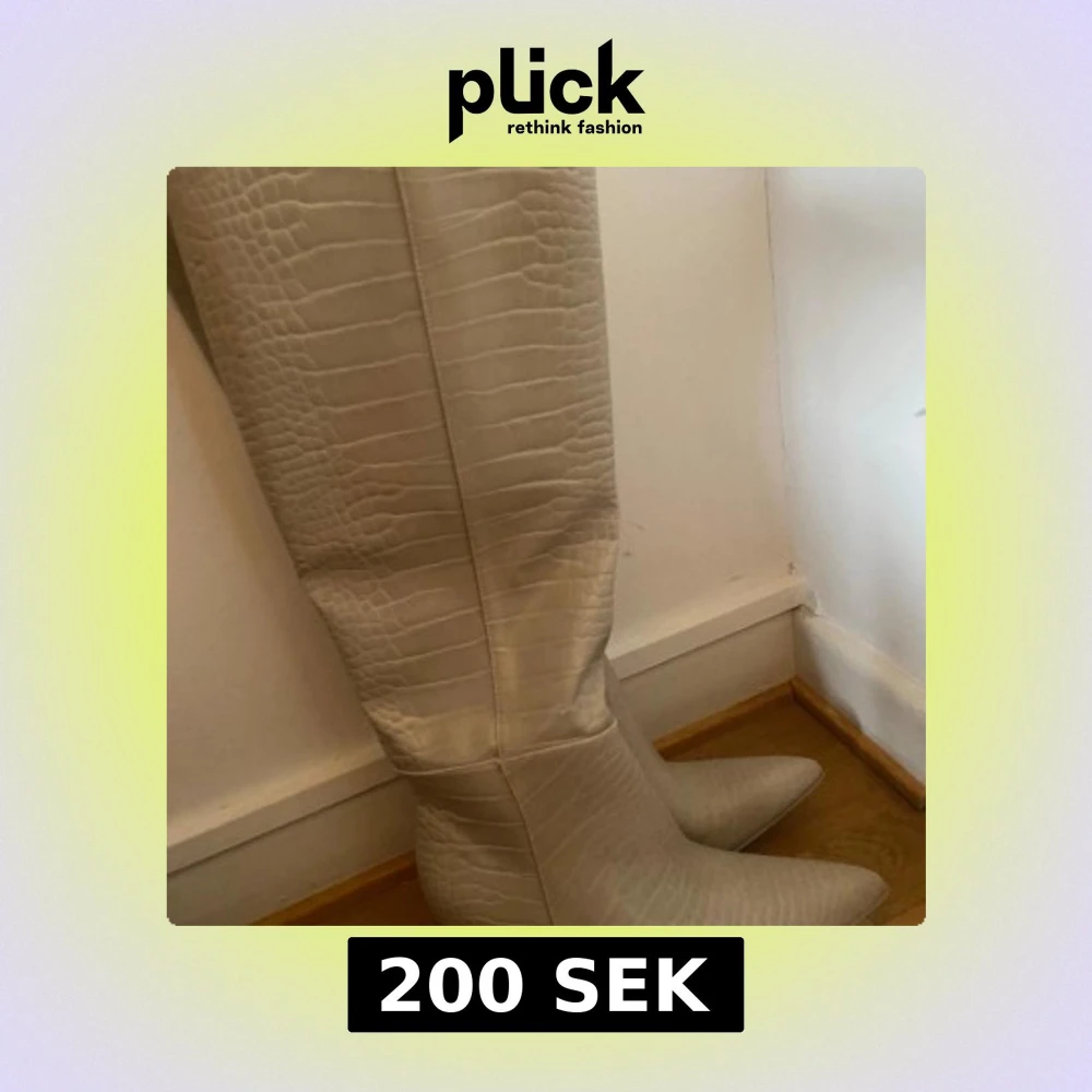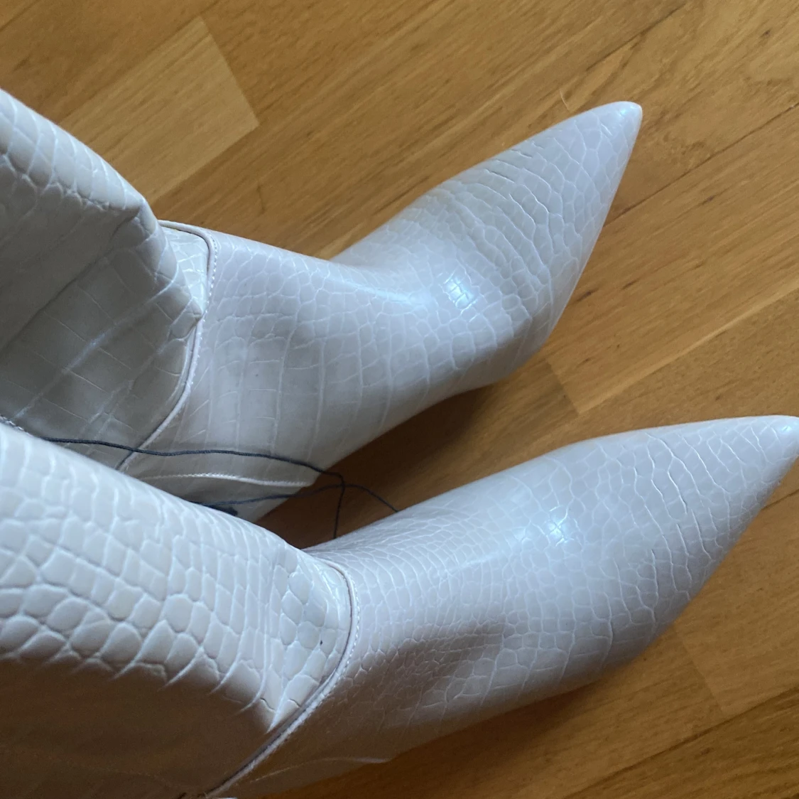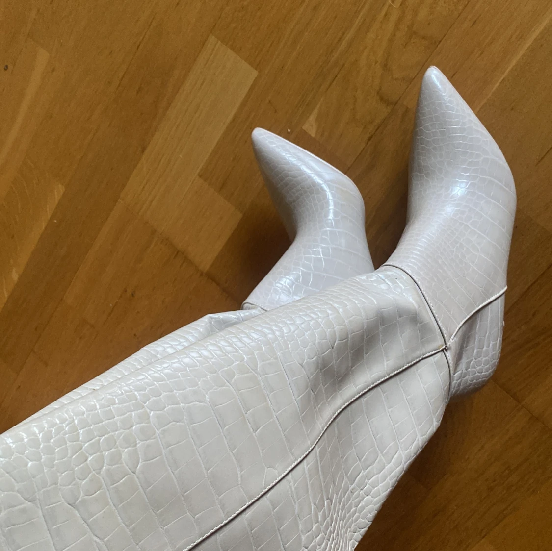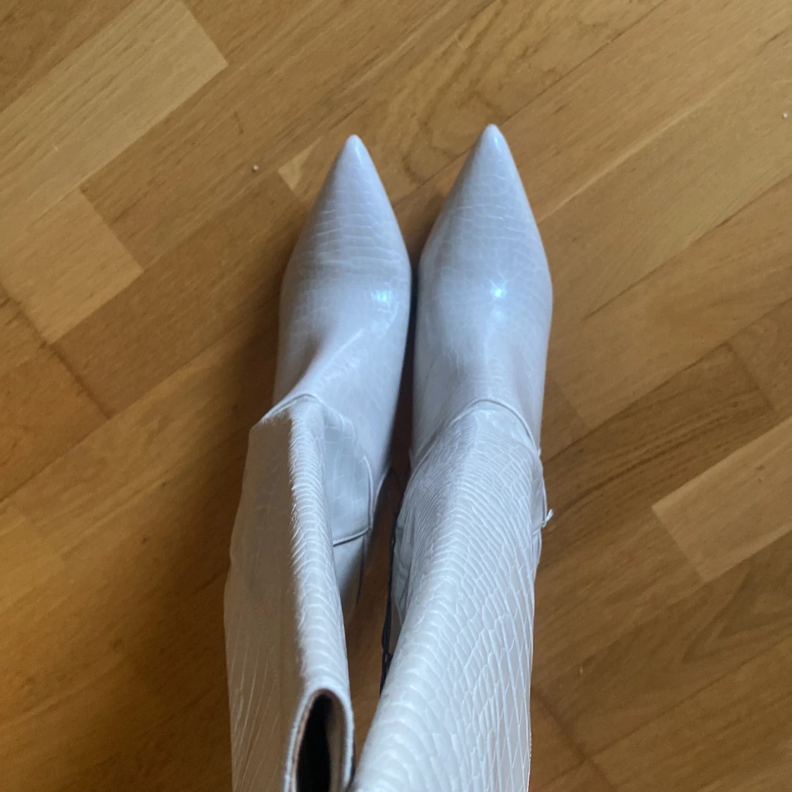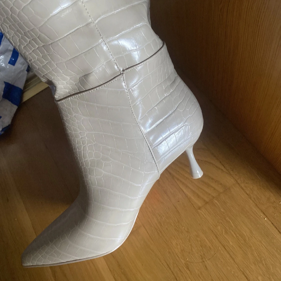 Snygga beige stövlar med krokodilmönster och spetsig tå. Perfekta för att ge en trendig touch till din outfit. Storlek 38 helt nya med prislapp kvar.