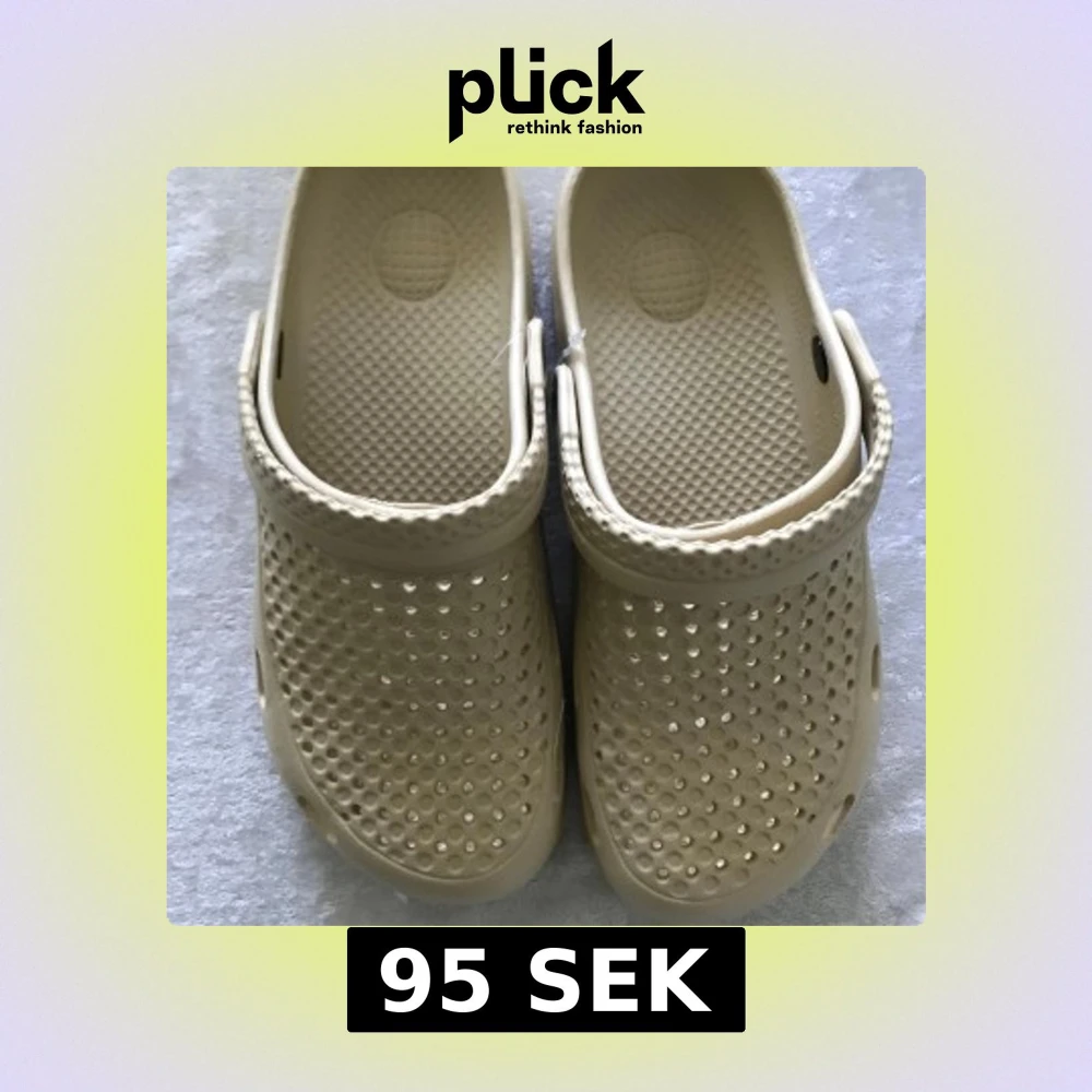 Säljer ett par beige tofflor med klassisk design och perforerad ovandel. Skorna har en justerbar hälrem och platt sula, perfekta för sommardagar eller som inneskor.