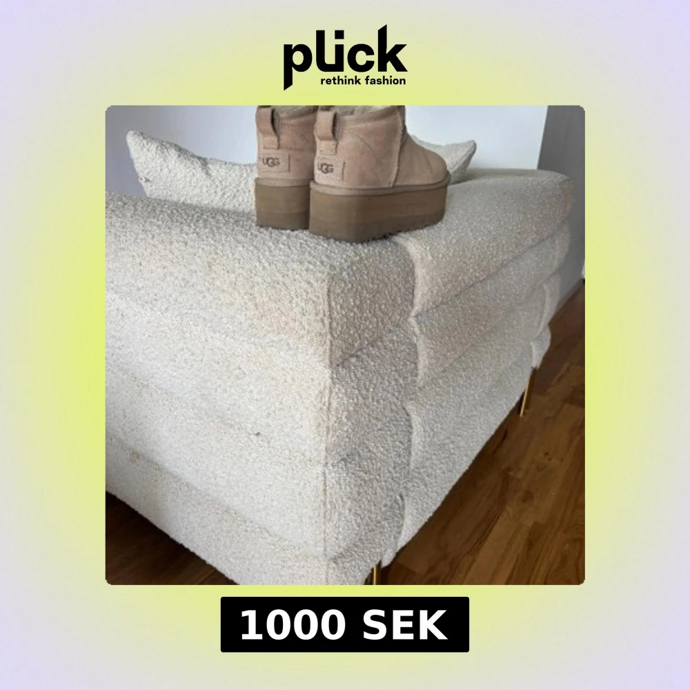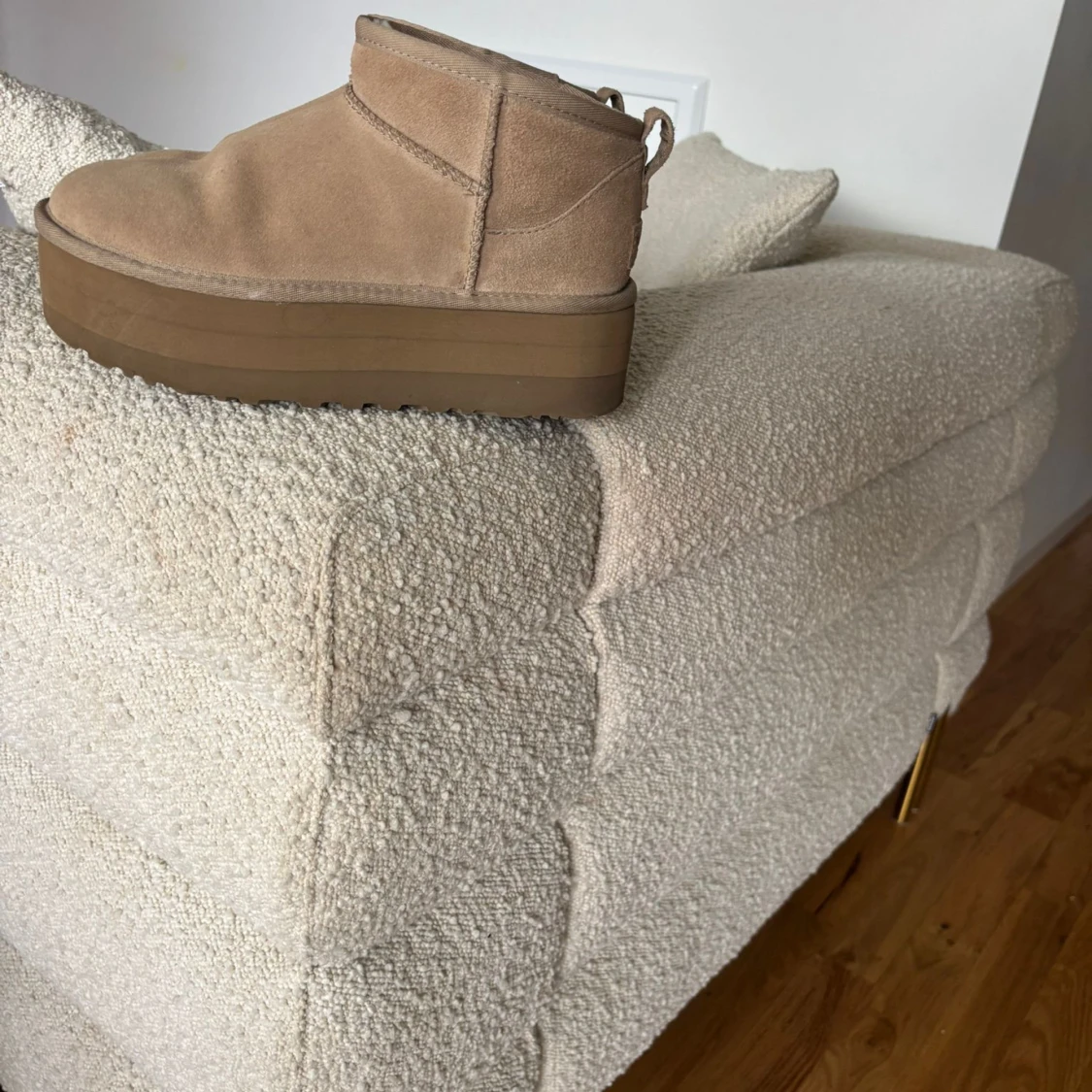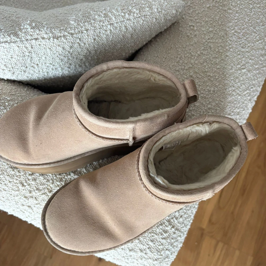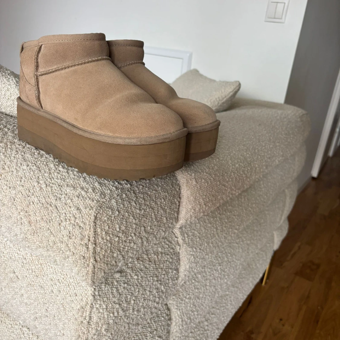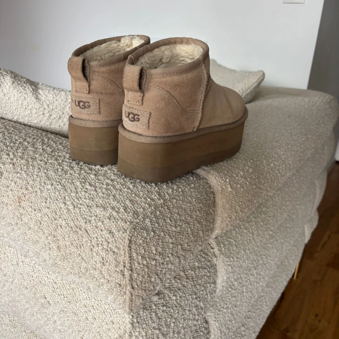 Säljer ett par beige UGG boots med plattformsula och rund tå. Skorna är tillverkade i mjuk mocka med fluffigt foder på insidan för extra komfort. De har en rejäl brun sula som ger höjd och en cool look. Perfekta för dig som gillar chunky boots och vill ha något varmt och stilrent.