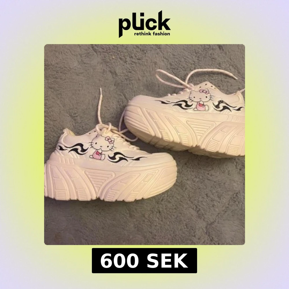 Unika vita sneakers med extrem platåsula, Hello Kitty-tryck i rosa och svart samt svarta flames på sidorna. Skorna har snörning och coolt tryck med 'Hello Kitty' på hälen. Perfekta för dig som vill sticka ut och addera kawaii-vibe till din stil. Hely ny