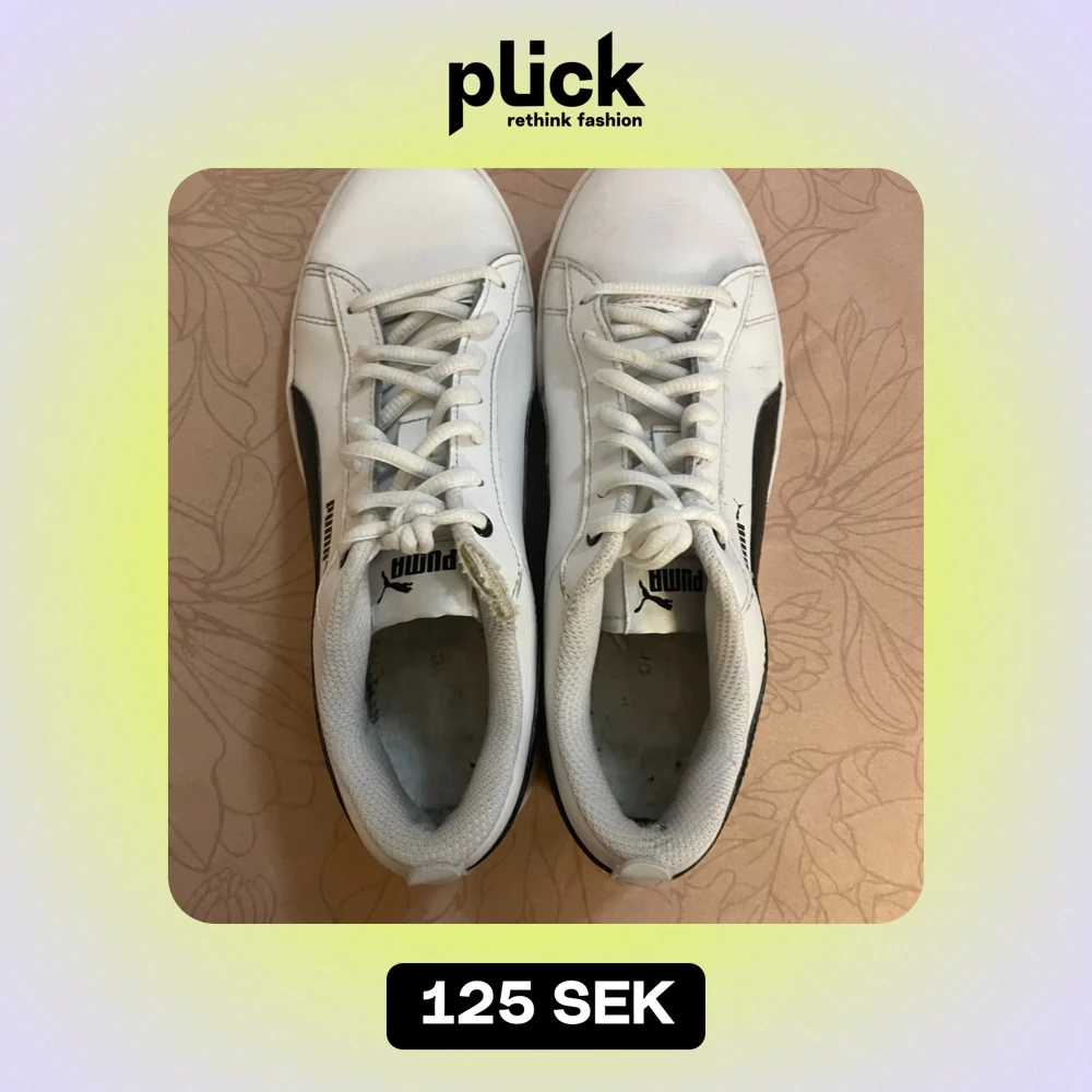 Säljer ett par vita Puma sneakers i skinn med klassisk svart logga på sidan. De har snörning och en stilren design. Den är använd men i ok skick