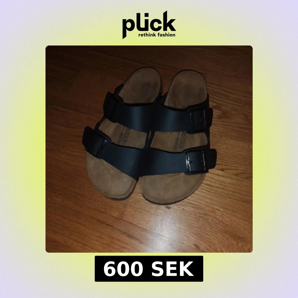 Säljer ett par svarta Birkenstock sandaler med två breda remmar och justerbara spännen. Sulan är i kork och gummi, och ovandelen är i syntetmaterial. Perfekt för dig som gillar klassisk stil och vill ha bekväma skor med platt sula.
