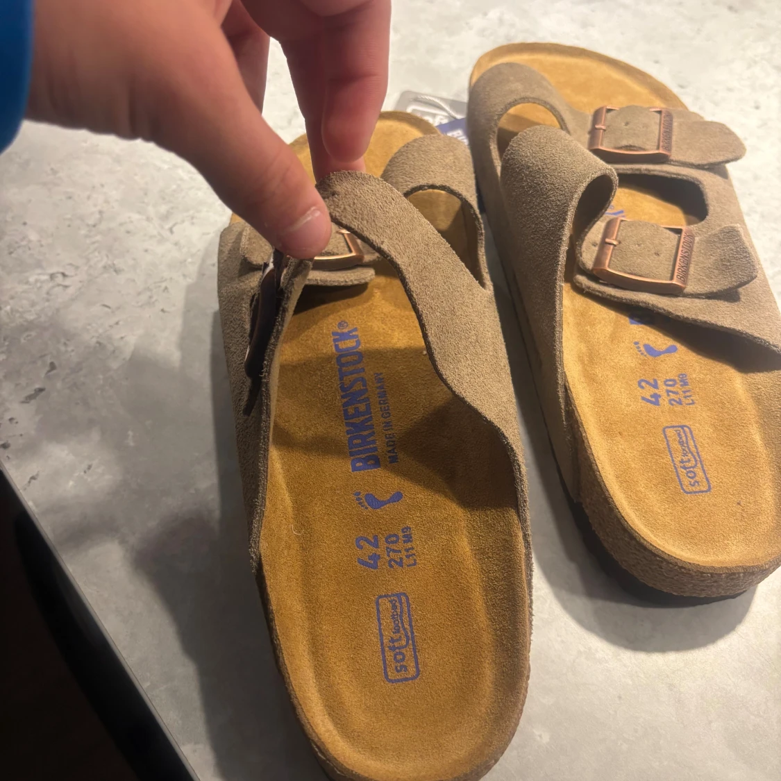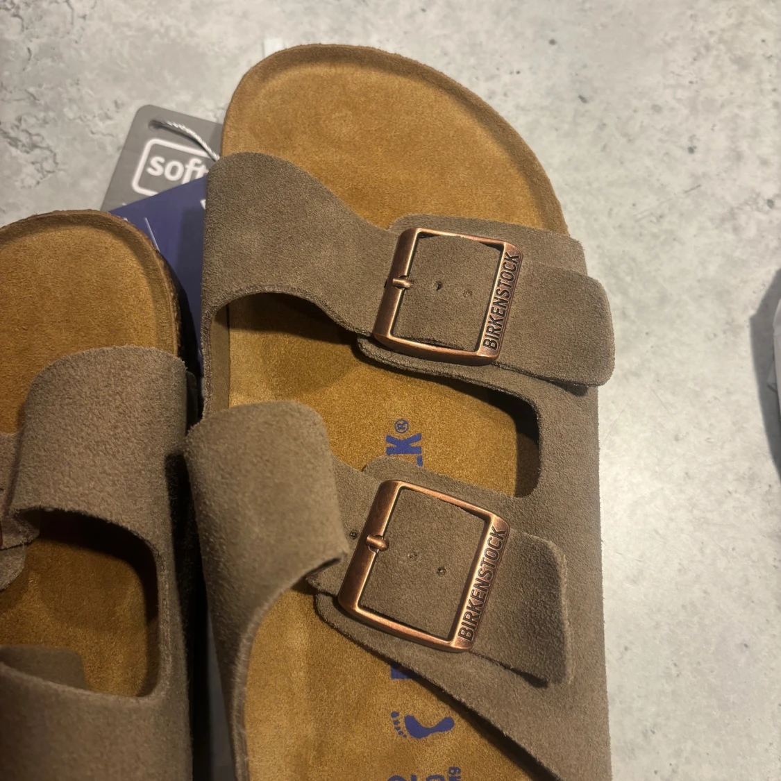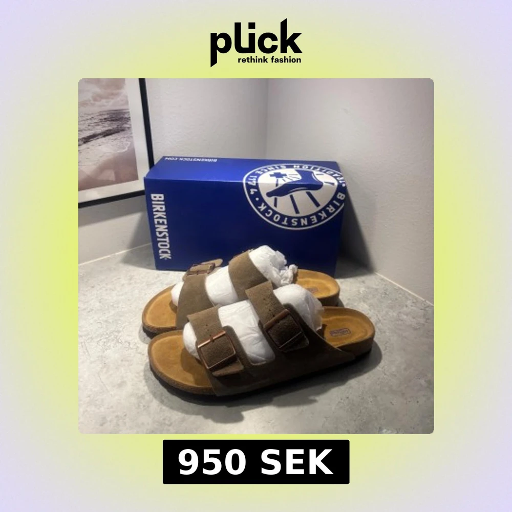 Säljer ett par klassiska Birkenstock sandaler i brun mocka med två breda remmar och justerbara metallspännen. Fotbädden är mjuk och anatomiskt utformad för extra komfort. Perfekta för sommaren och riktigt sköna att glida runt i.