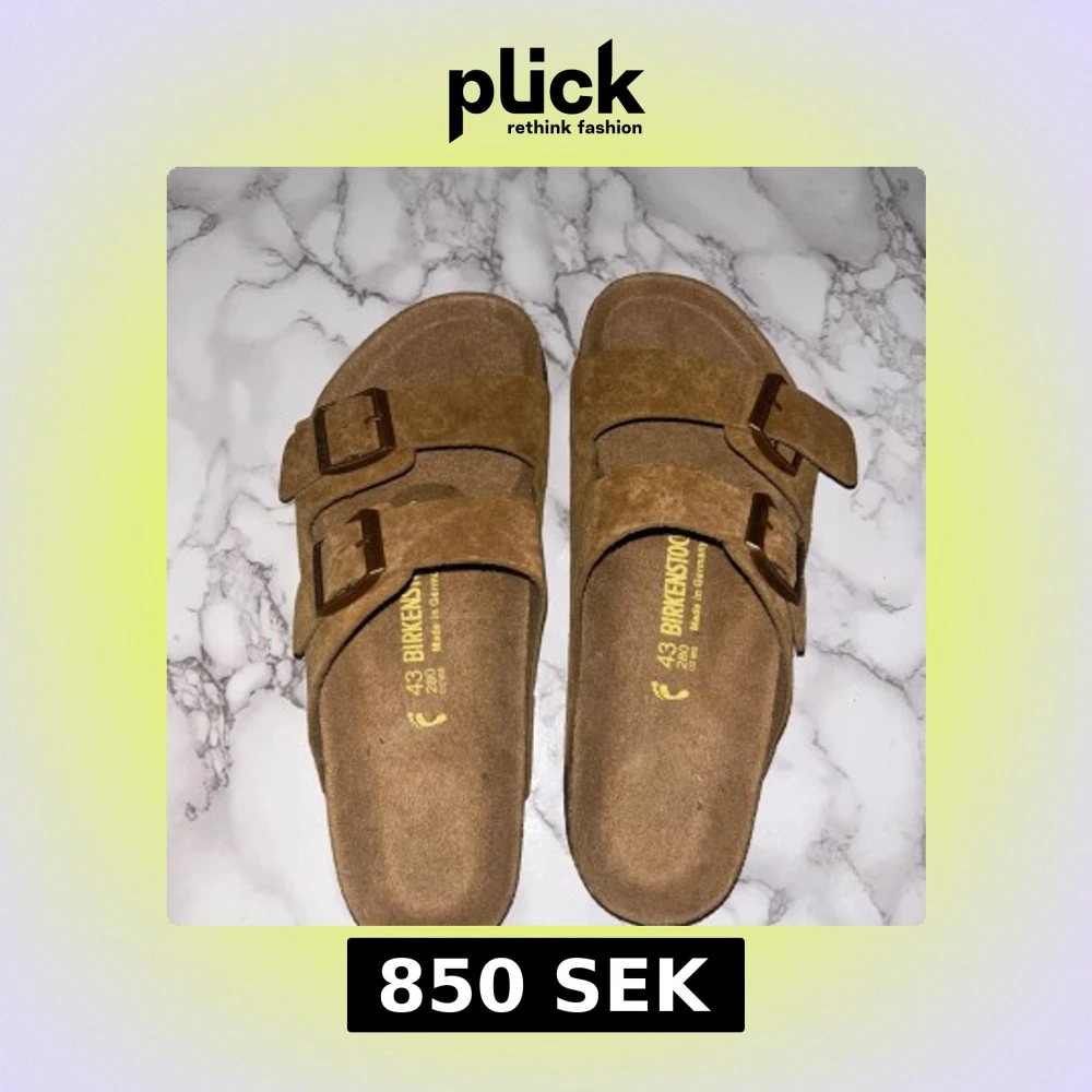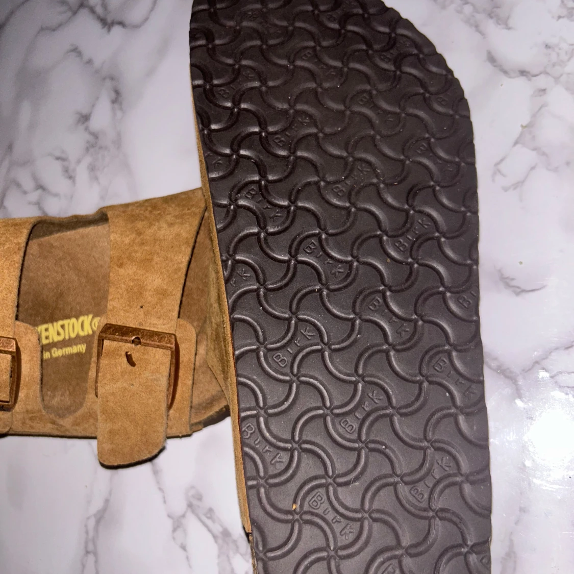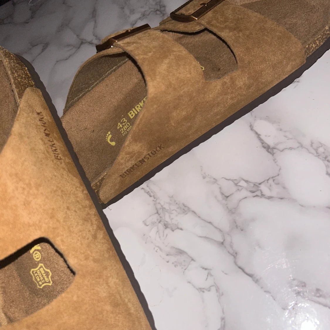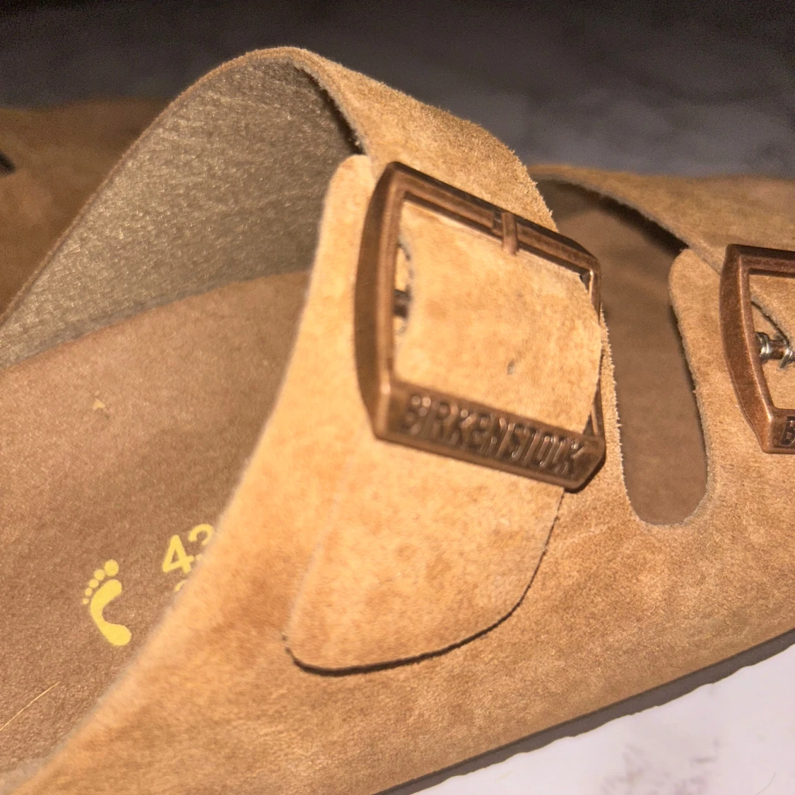 Säljer ett par klassiska sandaler från Birkenstock i brun mocka med två breda remmar och justerbara metallspännen. Skorna har en anatomiskt utformad fotbädd och svart sula med mönster. Perfekta för chill dagar och enkel stil.