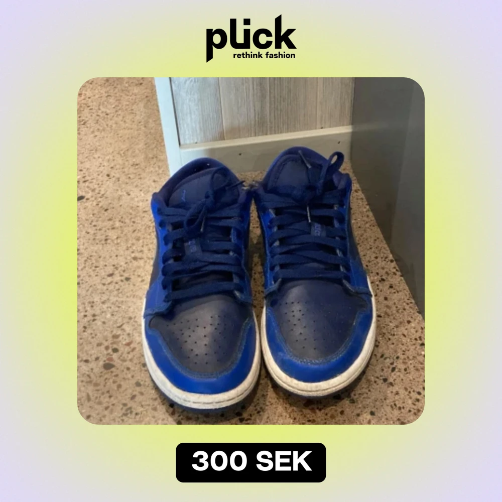 Säljer ett par blå Nike Air Jordans i välanvänt skick. Skorna har en snygg blå färg med grå detaljer och klassisk snörning. Perfekta för vardagsbruk eller för att ge din outfit en sportig touch.