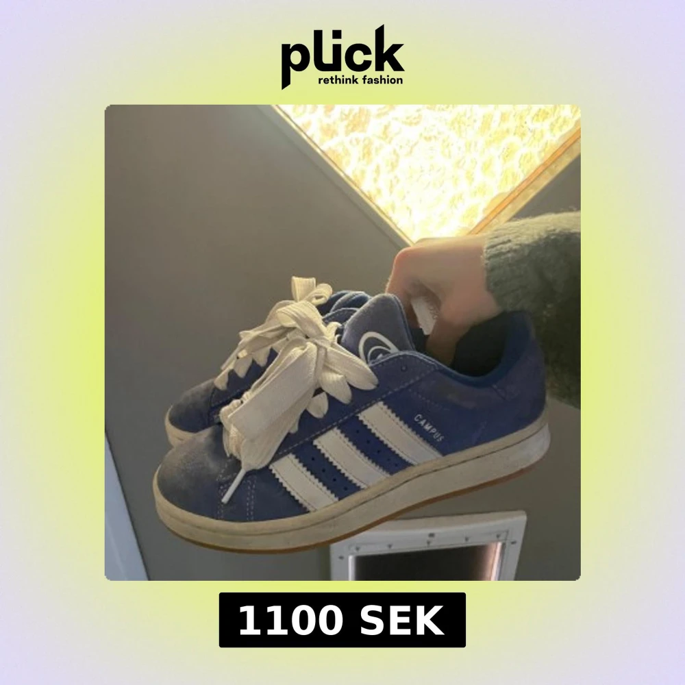 Snygga blå Adidas Campus sneakers med vita ränder och snörning. Perfekta för en avslappnad stil. Skorna har en klassisk design med en väldigt bekväm sula. Använda en halv sommar, pris kan diskuteras via snabbköp. Blåa snören hänger me (helt oanvända)