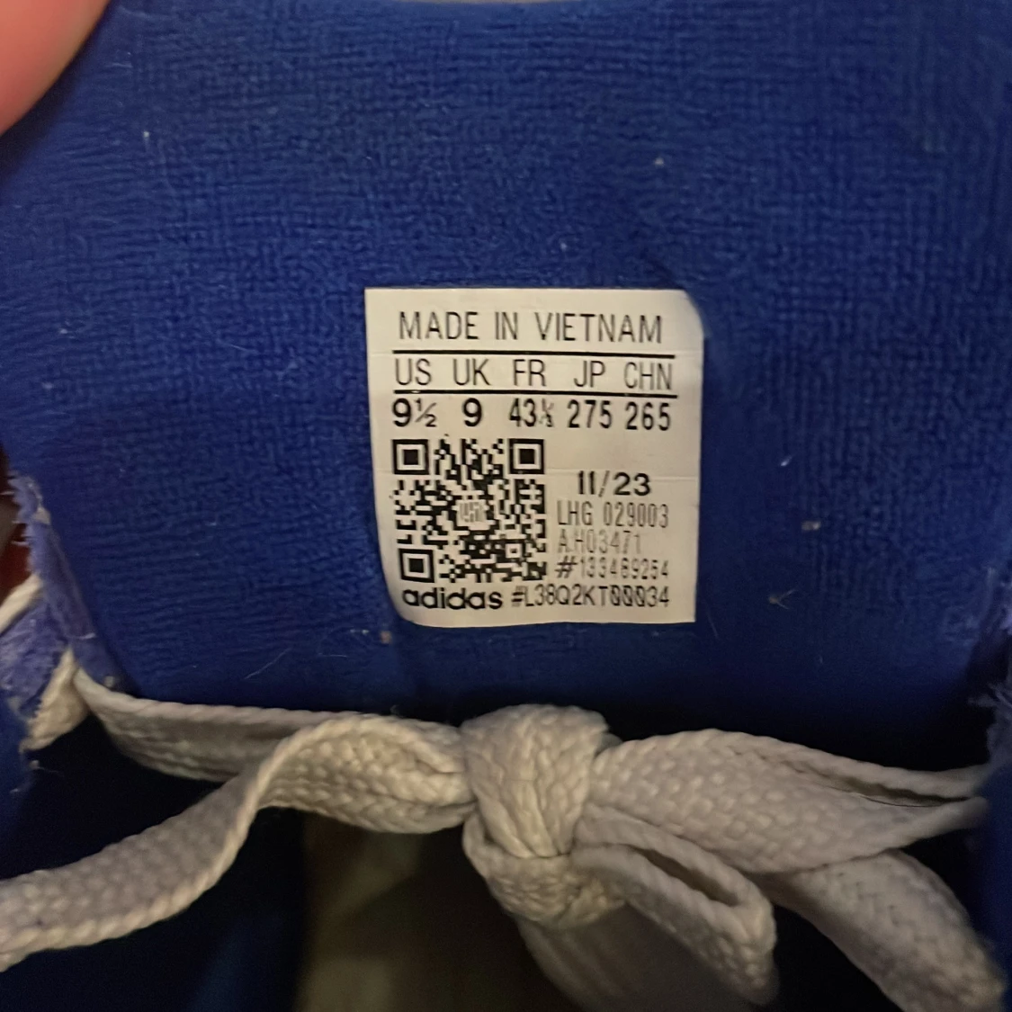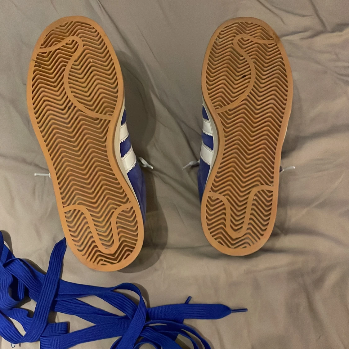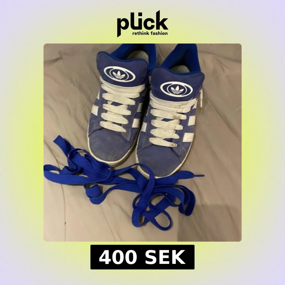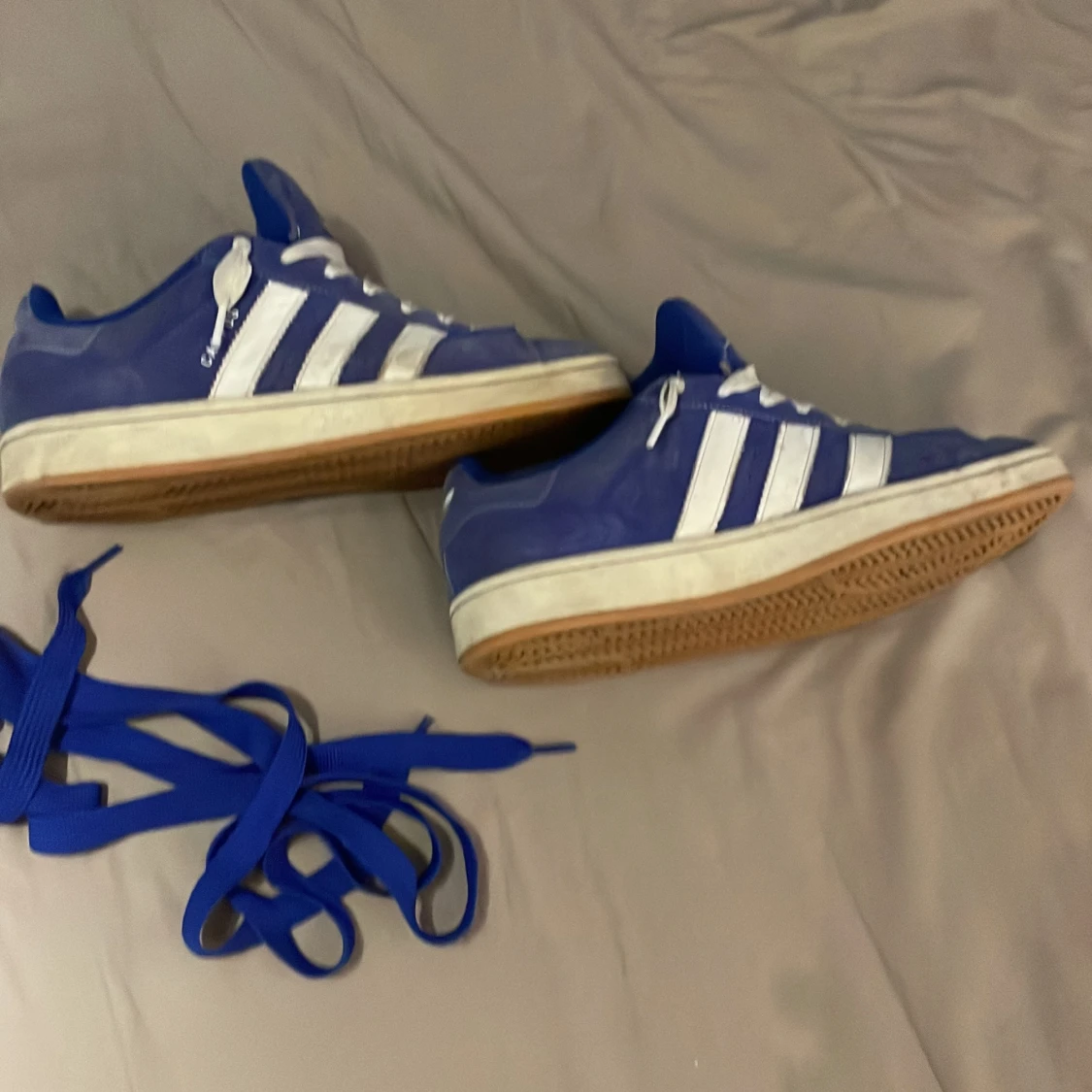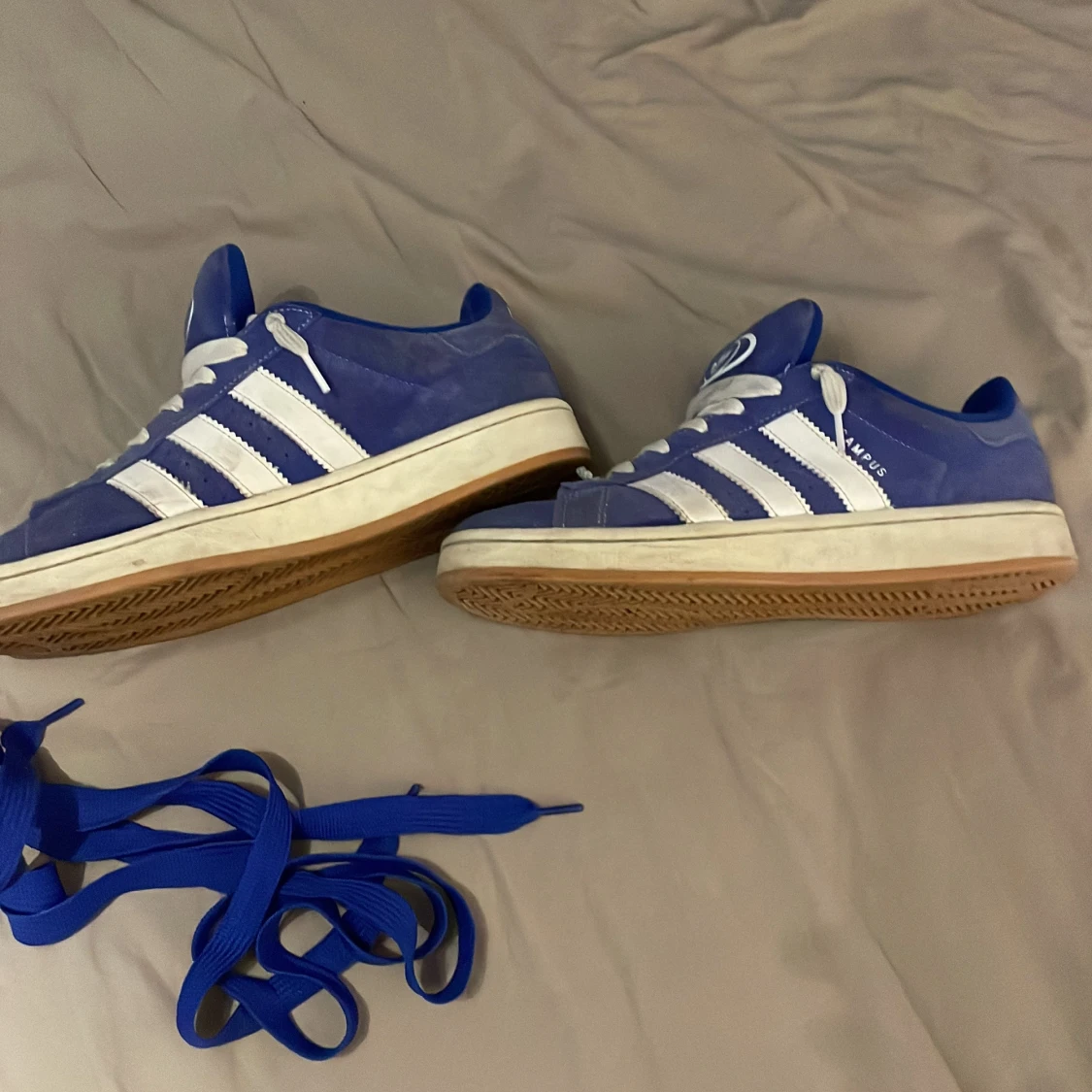 Säljer ett par blå Adidas Campus sneakers med klassiska vita ränder och gummisula. Skorna har rund tå, platt sula och kommer med både vita och blå skosnören. Perfekta för dig som gillar retrostil och streetwear. 9/10 det enda som skulle behövas göras är att tvätta upp lite.
