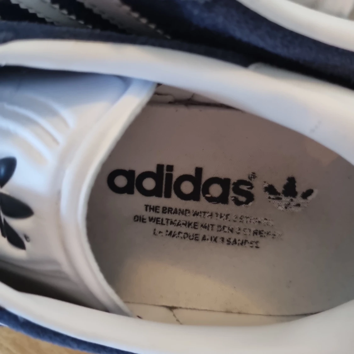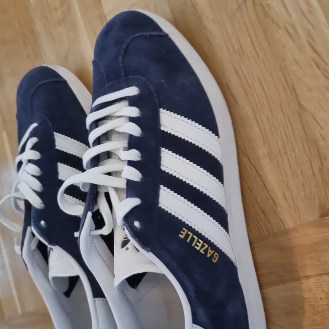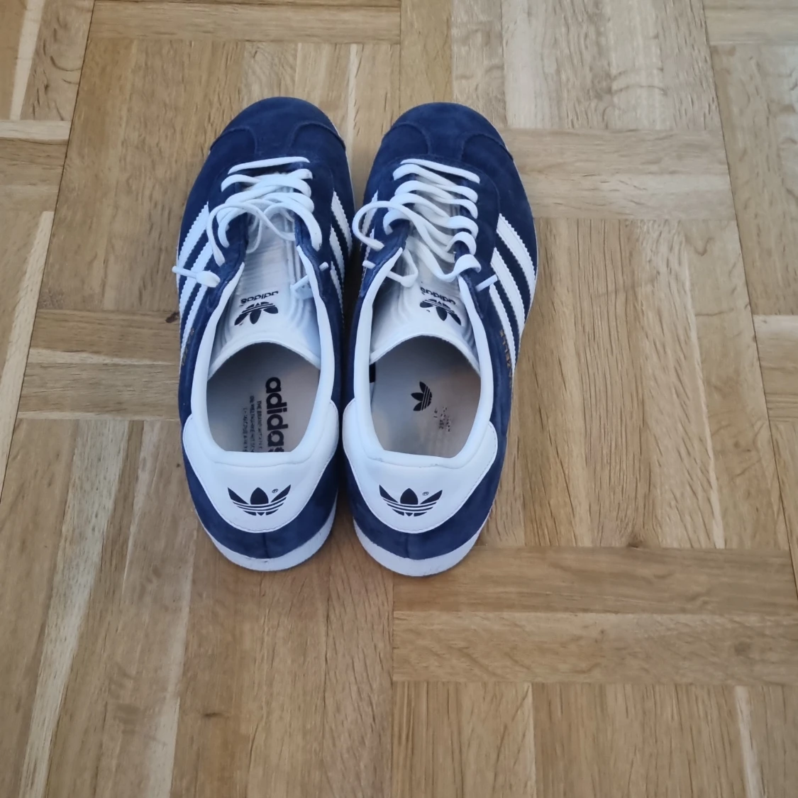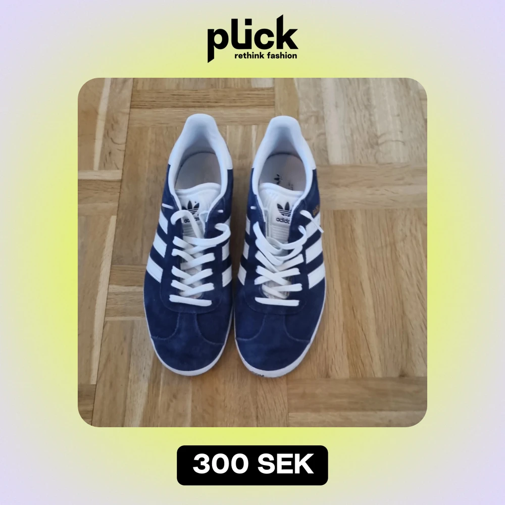 Säljer ett par snygga blå Adidas Gazelle sneakers i mocka. De har de klassiska vita ränderna och snörning. Perfekta för både vardag och fest! Skorna är i mycket bra skick och redo för en ny ägare.