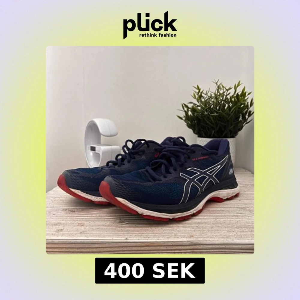 Säljer ett par Asics Gel-Nimbus 20 sneakers i marinblått med vita och röda detaljer. Skorna har en rund tå, snörning och en platt sula med röd och blå undersida. Ovandelen är i ventilerande syntetmaterial och mesh, perfekt för dig som gillar att träna.