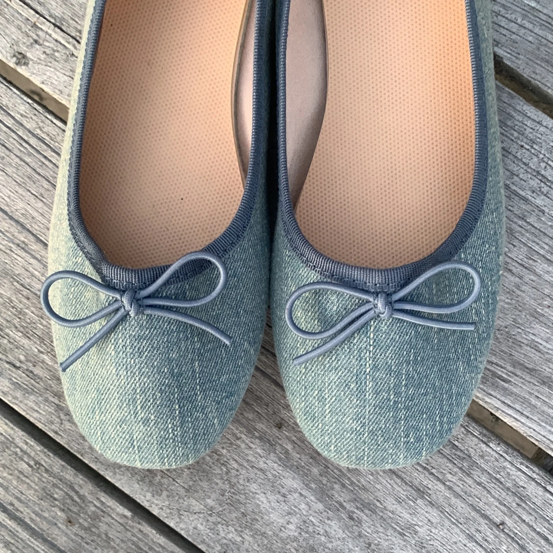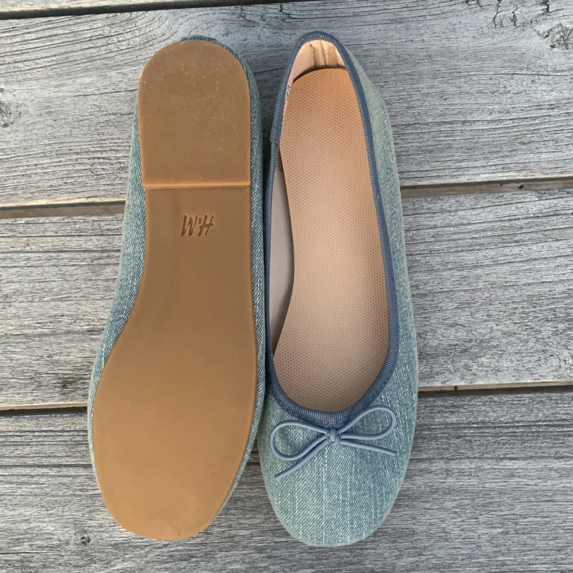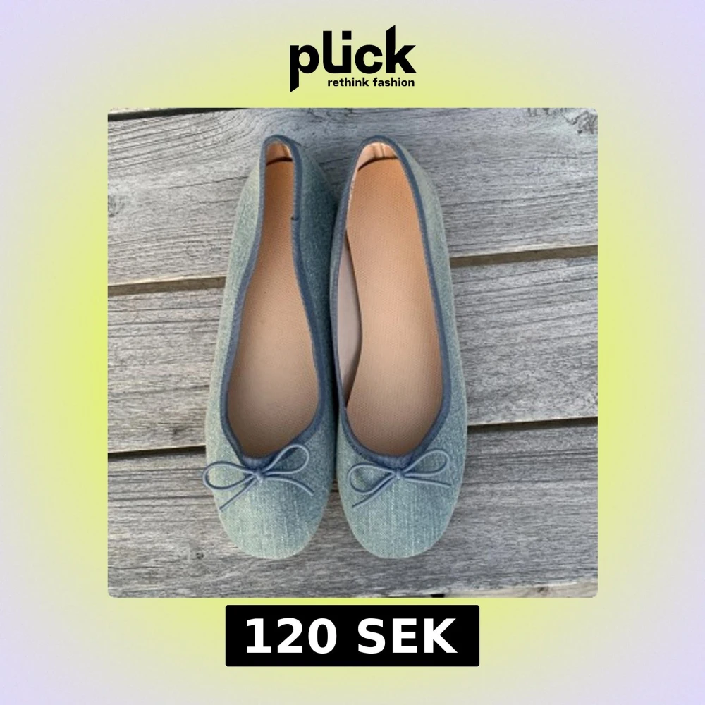 Snygga blå ballerinaskor från H&M med en söt rosett på ovansidan. Skorna är tillverkade i ett jeansliknande material och har en bekväm passform. Perfekta för en avslappnad stil.