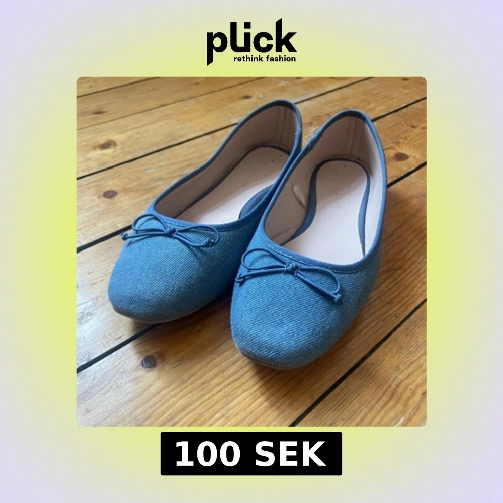 Snygga blå ballerinaskor i jeanstyg med rund tå och liten rosett framtill. Storlek 37, i fint skick!