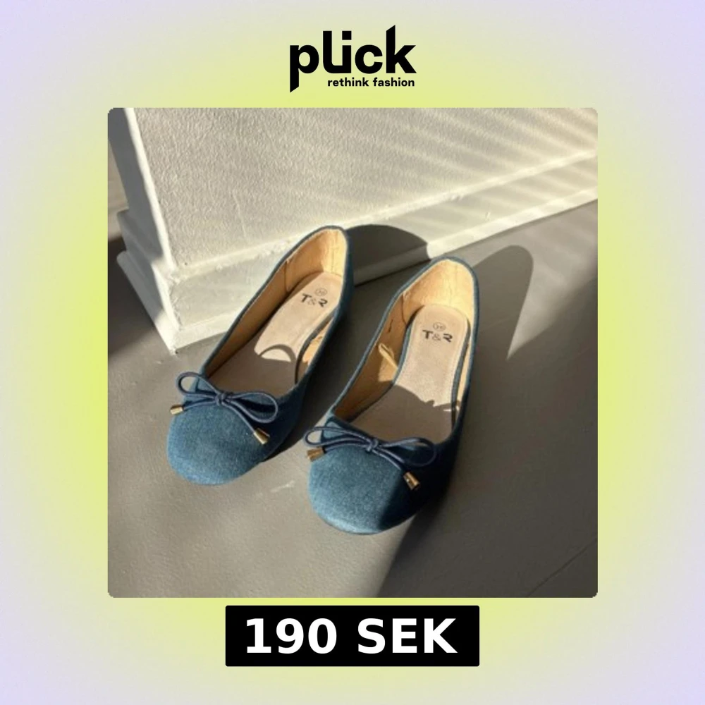 Säljer ett par blå ballerinaskor från T&R med söt rosettdetalj framtill och små guldfärgade metalldetaljer. Skorna har rund tå och är tillverkade i ett tygmaterial som påminner om jeans.