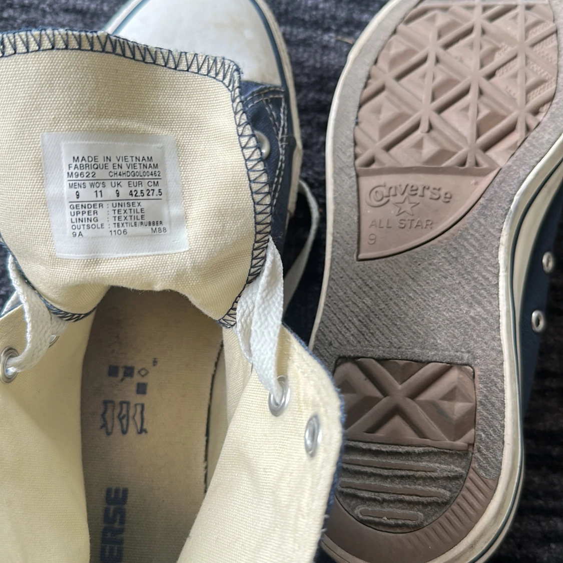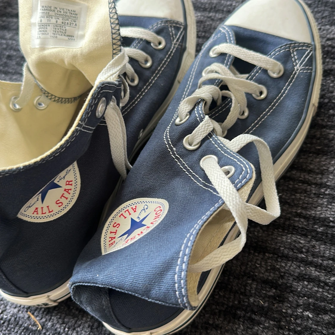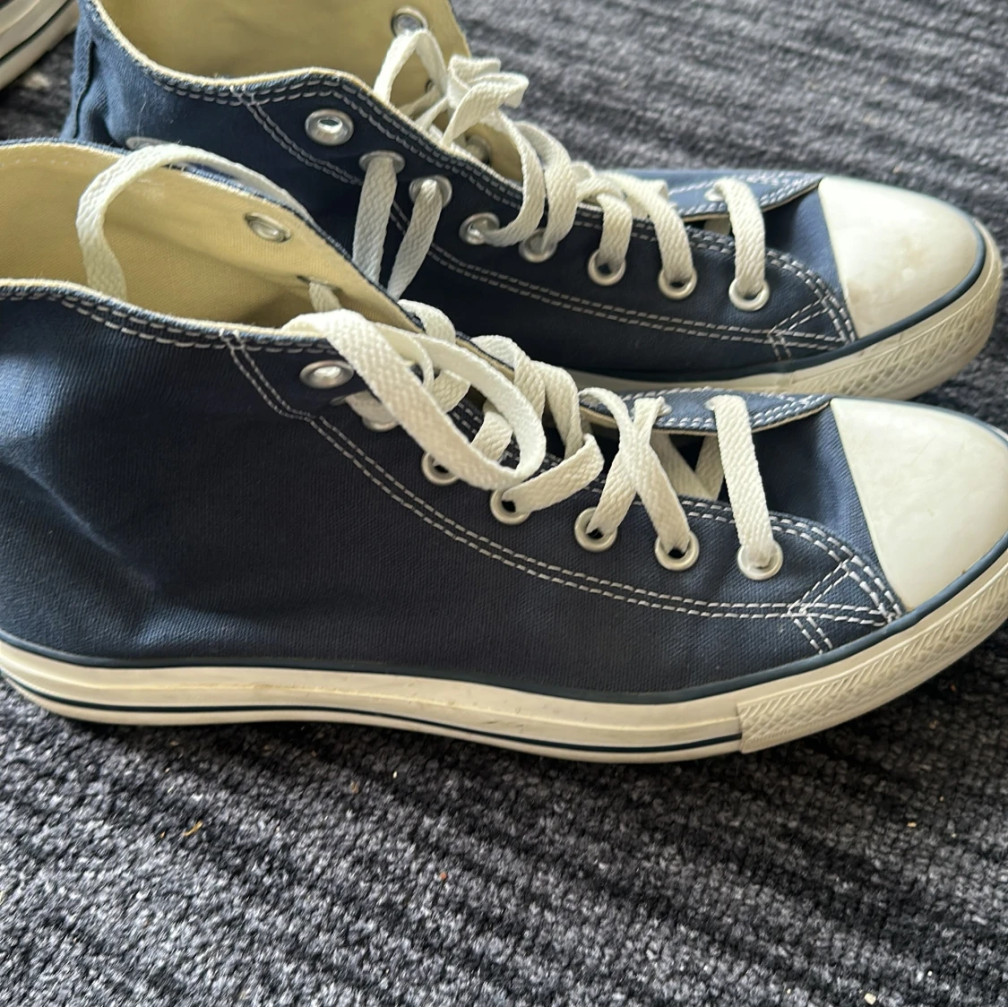 M9622, Klassiska blå Converse All Star high-top sneakers med vit tå och vita snören. Skorna har rund tå, platt sula och tydliga vita sömmar. Perfekta för en avslappnad och stilren look.