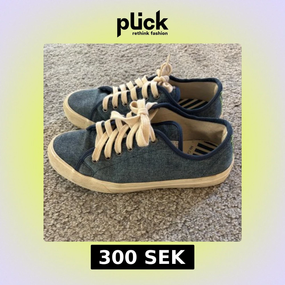 Snygga sneakers från Mr. Cat i blått denimtyg med vita snören och kontrastdetaljer i grönt på hälen. Skorna har rund tå, platt sula och insida i beige bomull. Perfekta för dig som gillar avslappnad stil med en twist. Små defekter men inget som är speciellt synligt! (Skickas inom 24h efter köp)