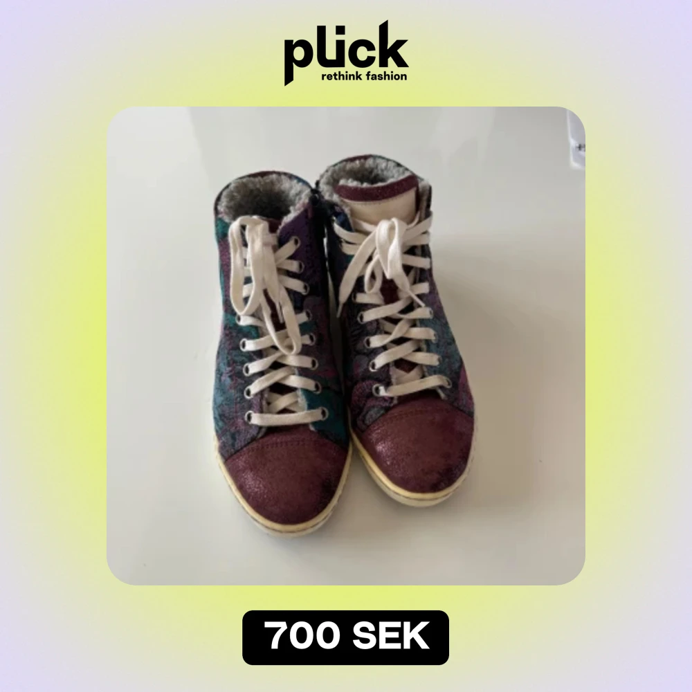 Unika handgjorda italienska sneakers med läderdetaljer och ett coolt mönster i lila, grönt och blått. Skorna har en fodring som gör dem perfekta för kyligare dagar. De har snörning framtill och en dragkedja på insidan. Nypris 2500kr