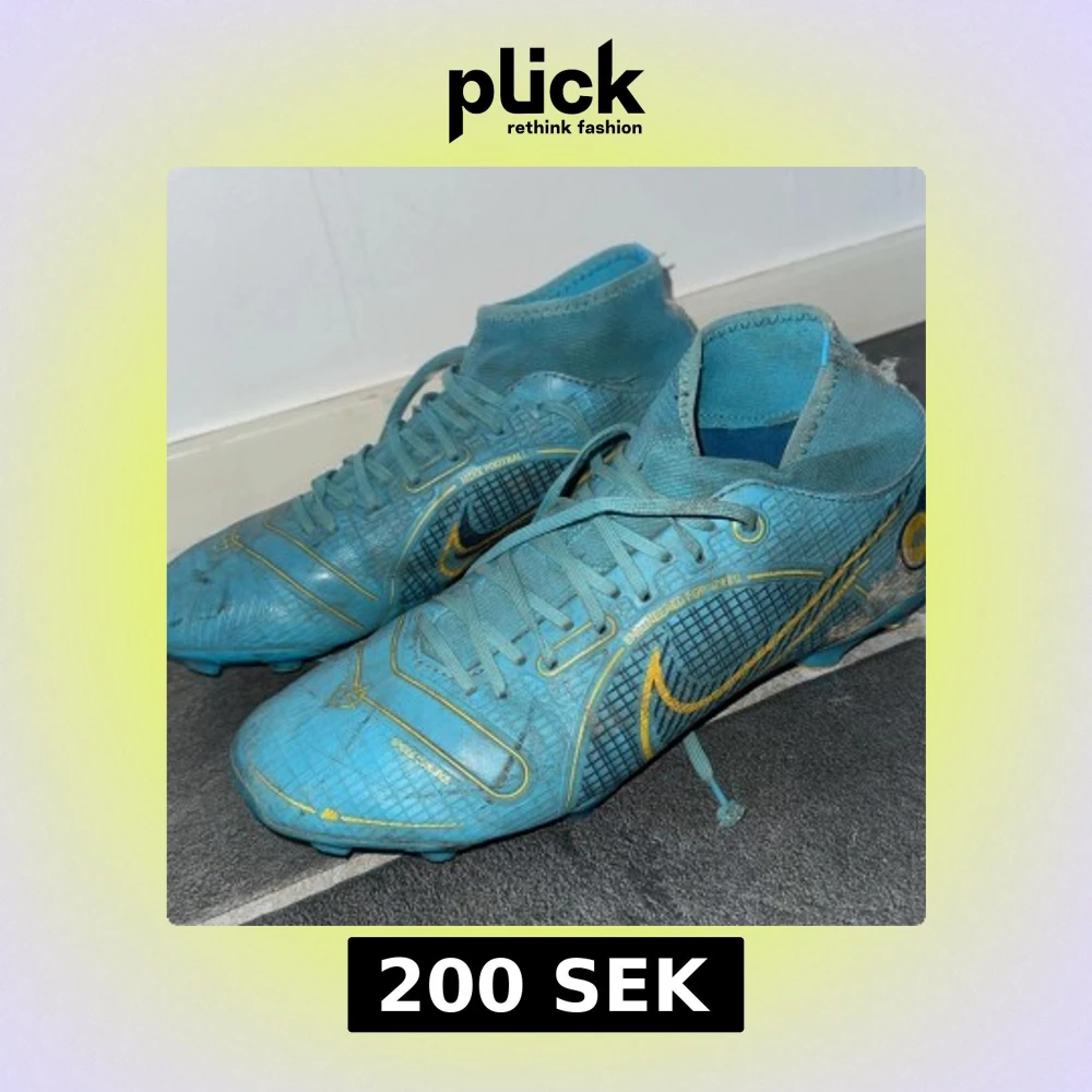 Jag säljer dessa blåa Nike mercurials som jag har använt för ca 4 år sen dem är slitna där i bak lite. Dem har ett litet hål men dem går fortfarande och använda annars är det inget fel med dem än att va smutsiga men såklart kan jag fixa det innan jag skickar ut.
