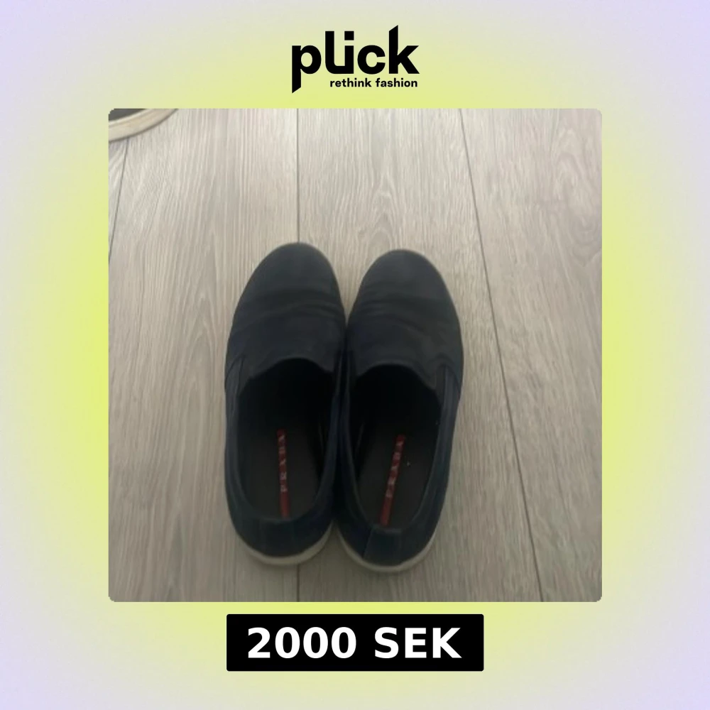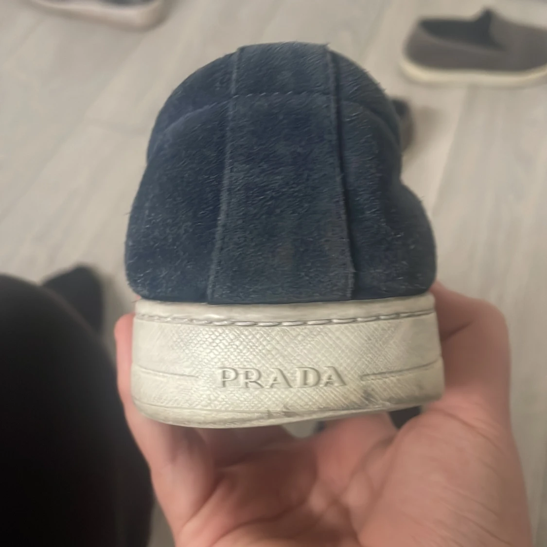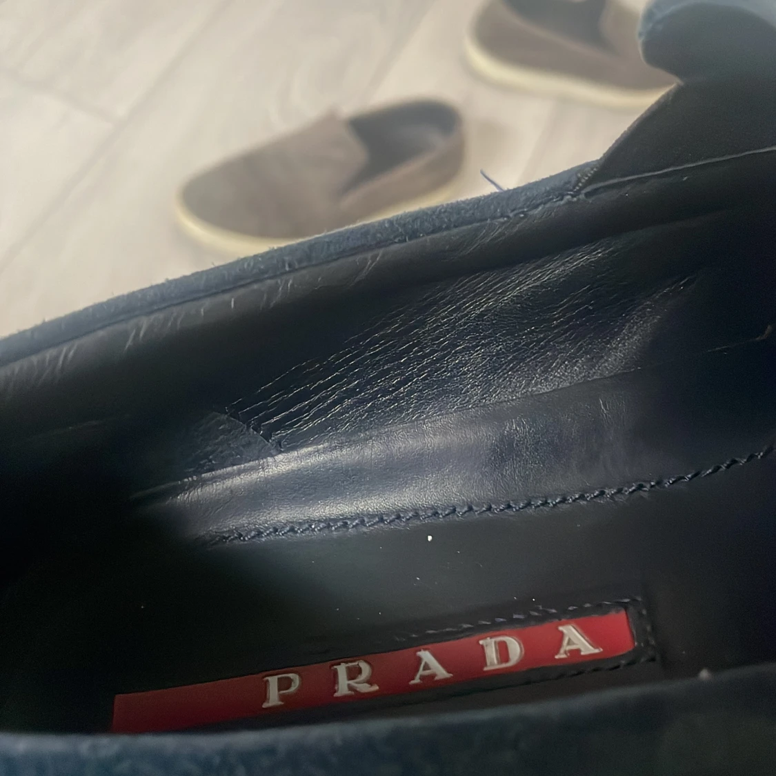 Snygga blå loafers från Prada i mocka med en stilren design. Skorna har en vit sula och Pradas logotyp synlig både inuti och på baksidan av sulan. Perfekta för en avslappnad men elegant look.