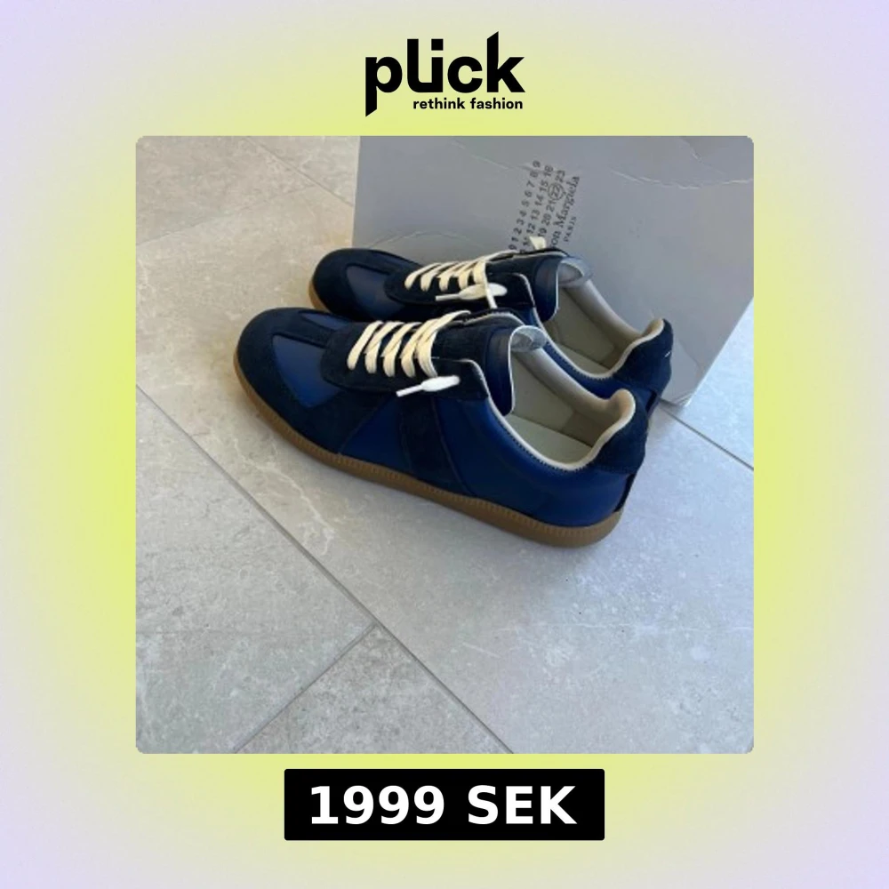 Maison Margiela sneakers i mörkblått med vita snören och beige insida. Ovandel i skinn och mocka, gummisula och rund tå. Klassisk sportig siluett med snygga kontraster mellan material och färger. Perfekt för dig som gillar stilrena och unika sneakers.