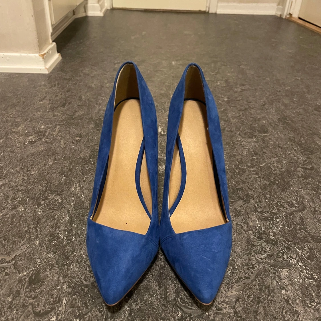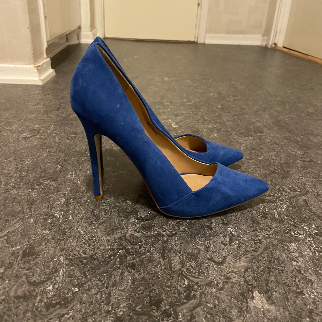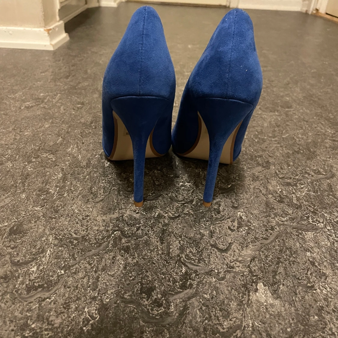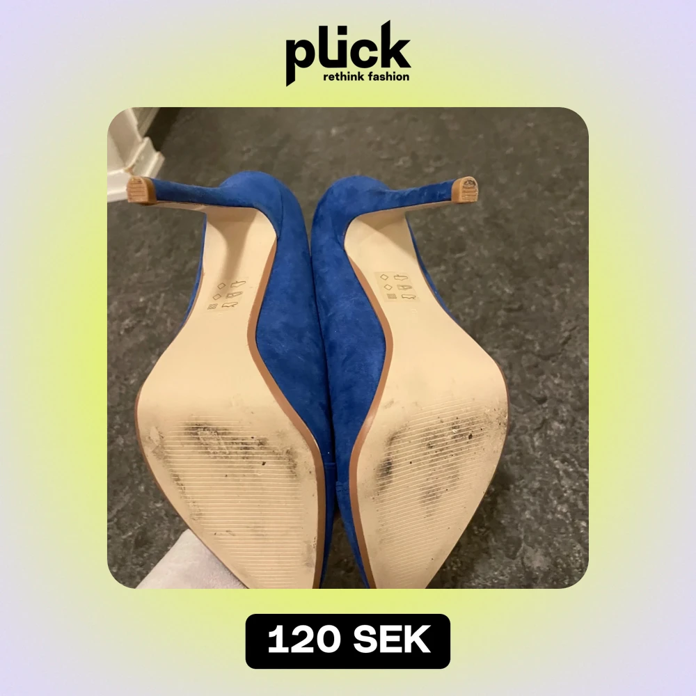 Snygga blå pumps i mocka med spetsig tå och hög klack. Perfekta för en utekväll eller fest. De har en elegant design som verkligen sticker ut. Använda men i bra skick, med lite slitage på sulorna.