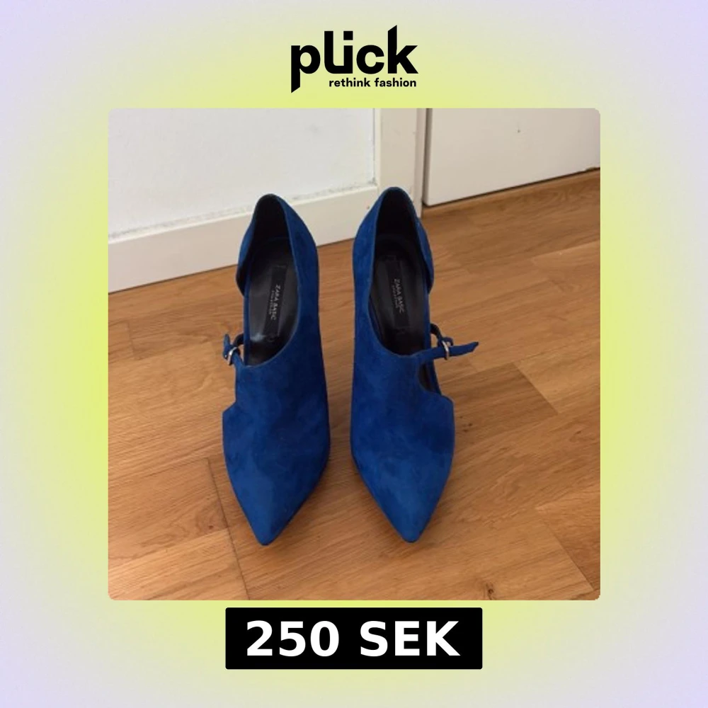 Snygga pumps i klarblå mocka från Zara med spetsig tå och hög klack. Skorna har en cool cut-out detalj på sidan och ett smalt spänne över foten. Perfekta för dig som vill sticka ut med färg och stil. Riktigt trendig siluett och elegant finish.