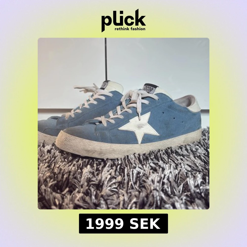 Snygga blå sneakers från Golden Goose med vit stjärndetalj på sidan och vita skosnören. Skorna är i mocka med vit hälkappa och platt sula. Klassisk GGDB-logga på plösen och väldigt unik. Väldigt bra skick. Storlek 43. Hör av dig!!