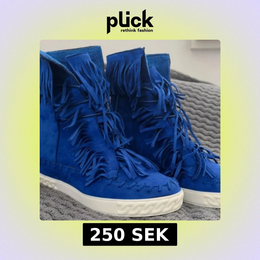 Unika boots i klarblå mocka med coola fransdetaljer längs skaftet och framtill. Skorna har vit sula o är även kilklack och rund tå, vilket ger en streetig vibe. Perfekta för dig som vill sticka ut med din stil och älskar statement-detaljer.