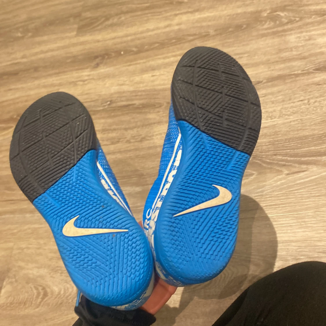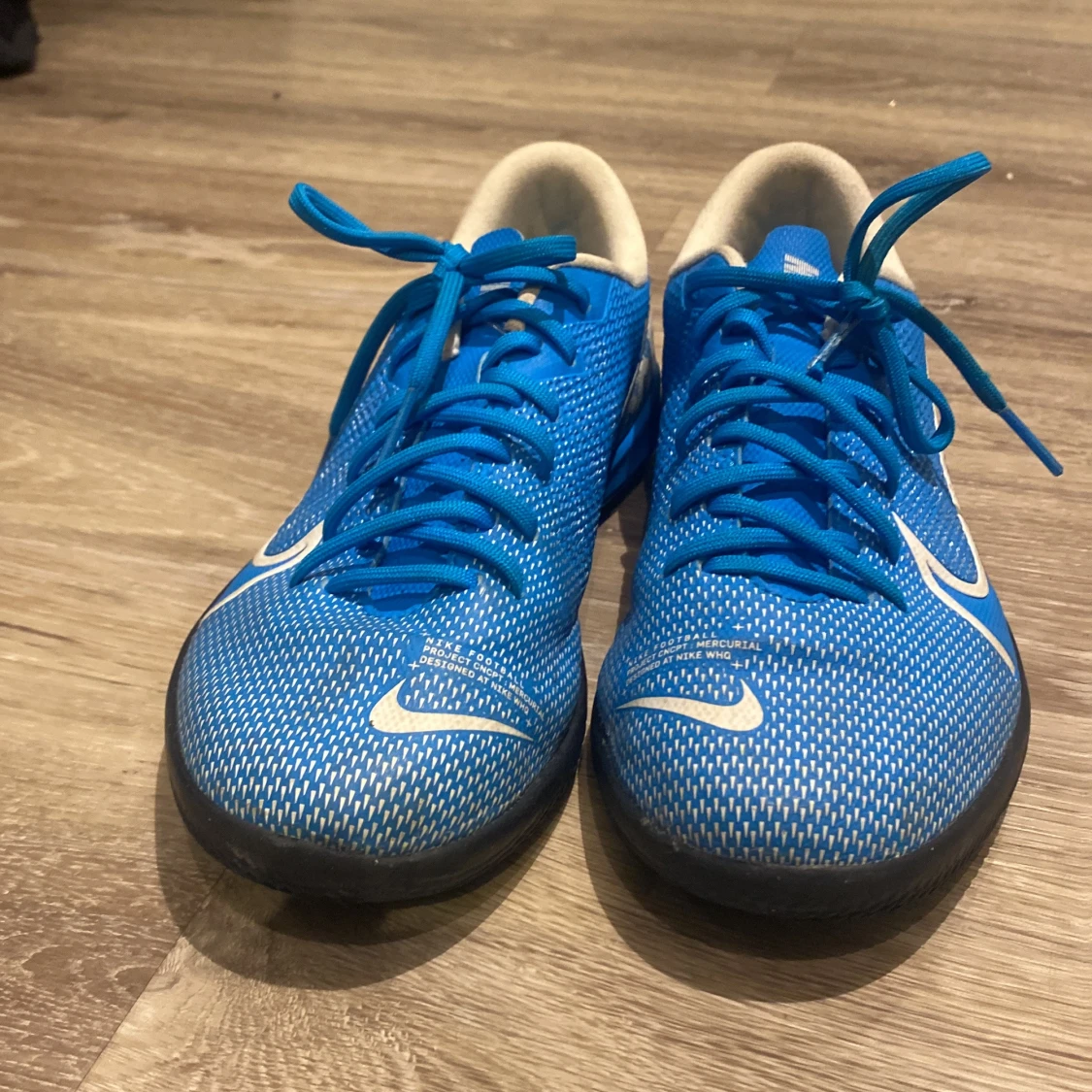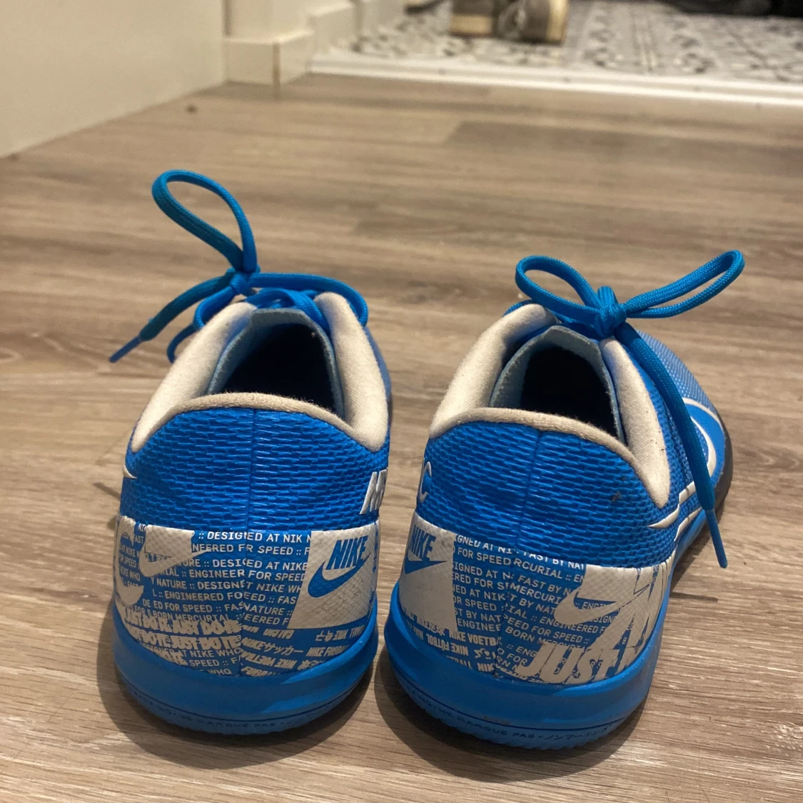 Snygga blå Nike sneakers med vit logga och textdetaljer på hälen. Skorna har snörning och en sportig design, perfekt för en aktiv livsstil.