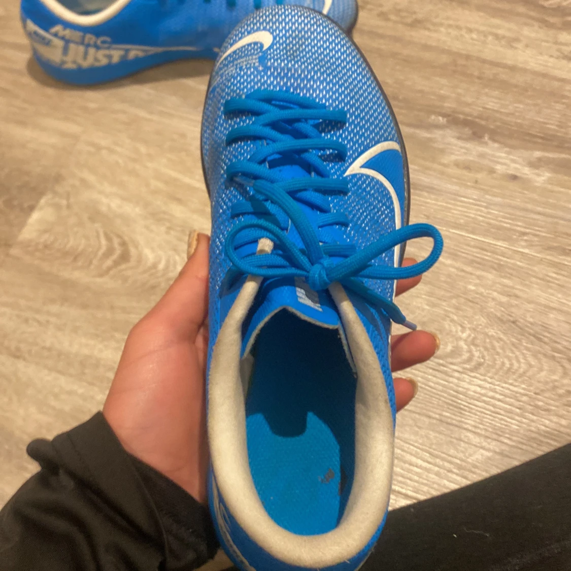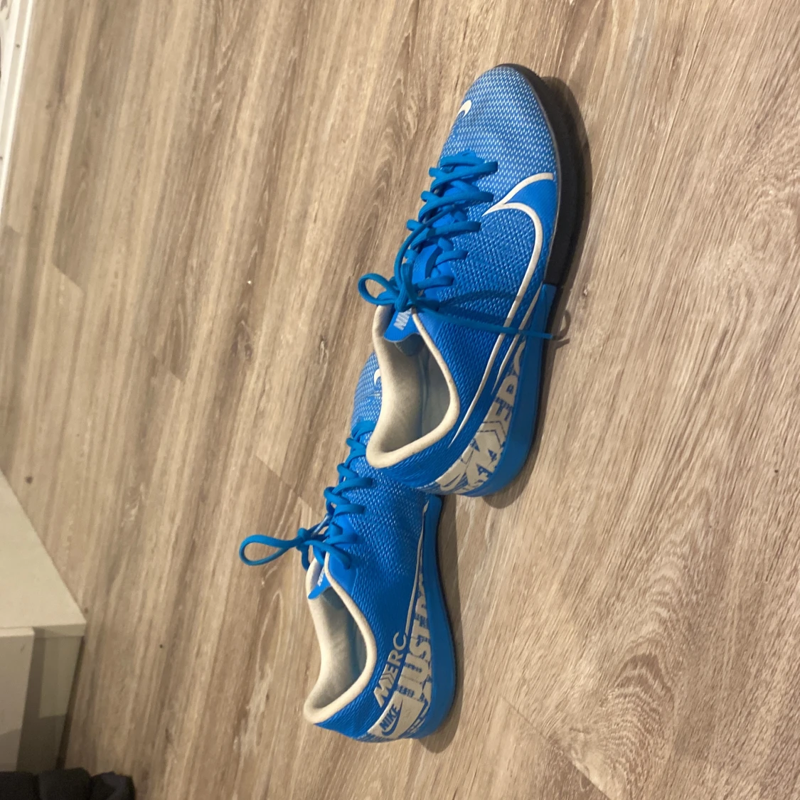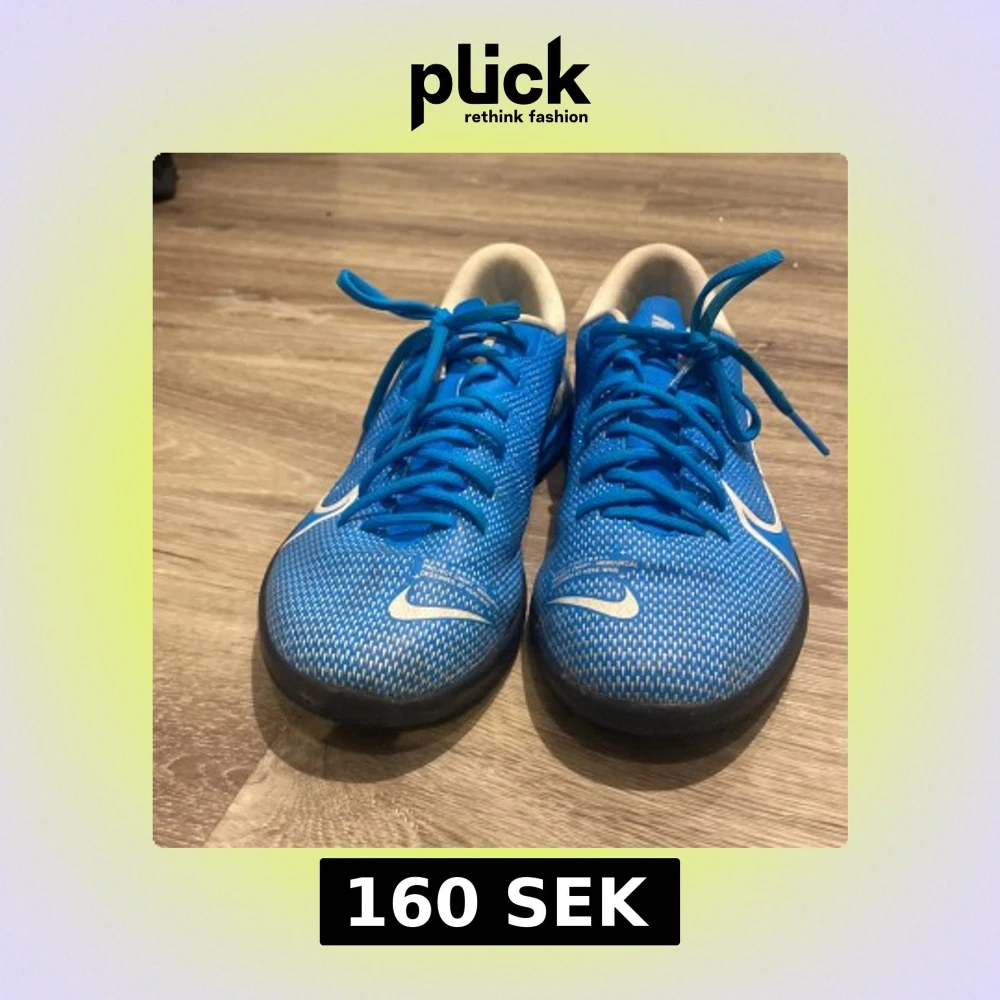 Snygga blå Nike sneakers med vit logga och textdetaljer på hälen. Skorna har snörning och en sportig design, perfekt för en aktiv livsstil.