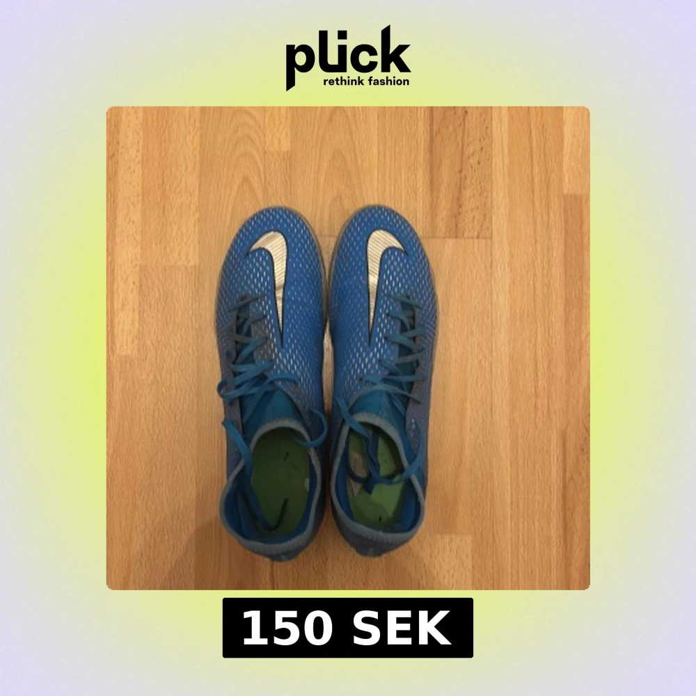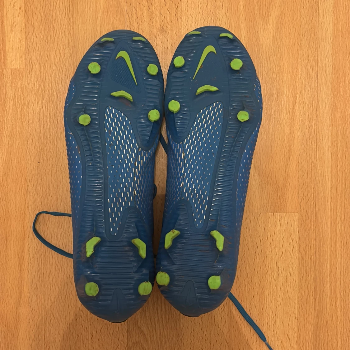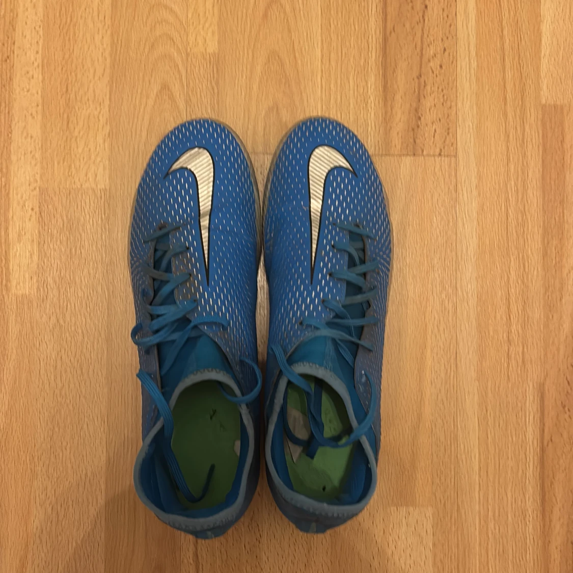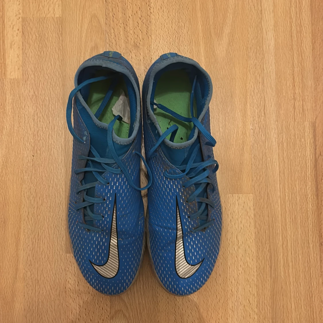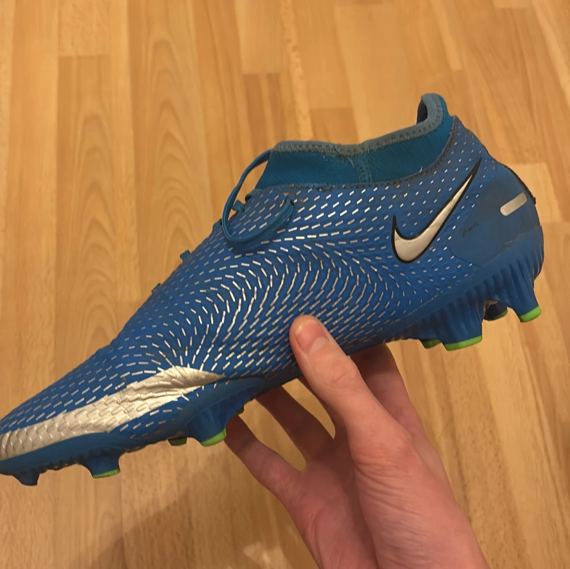 Snygga blå Nike Phantom fotbollsskor med silverdetaljer och snörning. Skorna har en modern design med gröna dobbar för optimalt grepp på planen. Perfekta för fotbollsspelare som vill ha stil och funktionalitet.