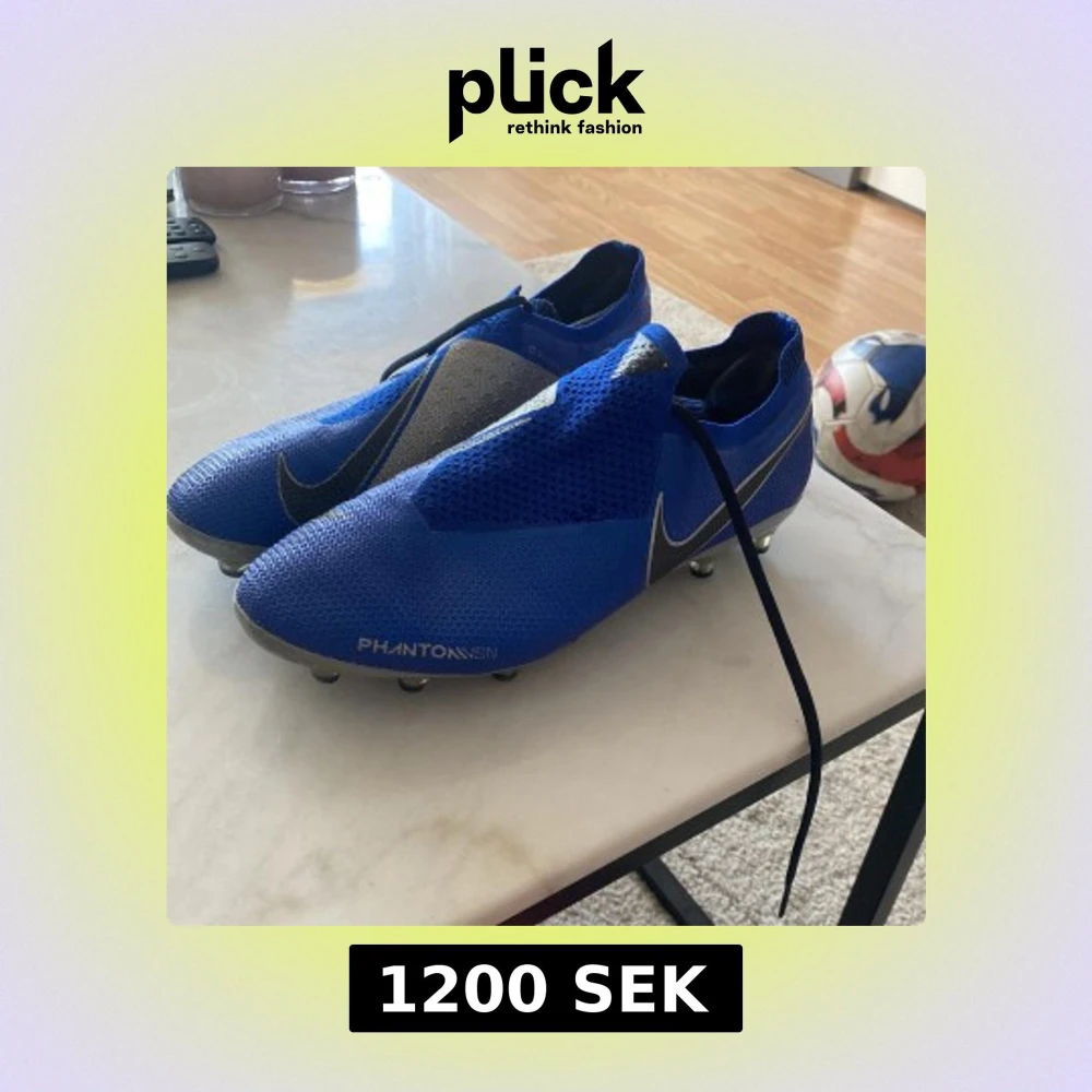 Säljer ett par blå Nike Phantom Vision fotbollsskor med silverfärgade detaljer och stor Nike-logga på sidan. Skorna har snörning och är designade för spel på gräs. Perfekta för dig som vill ha kontroll och precision på planen.