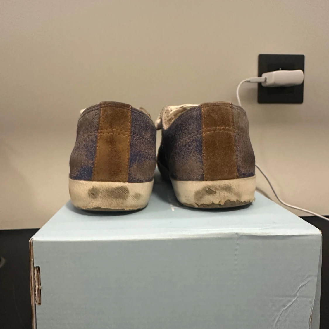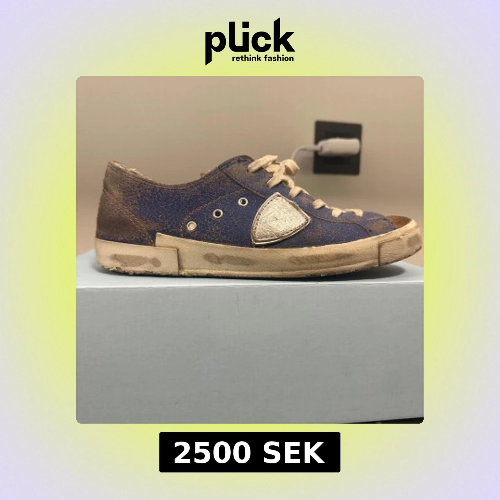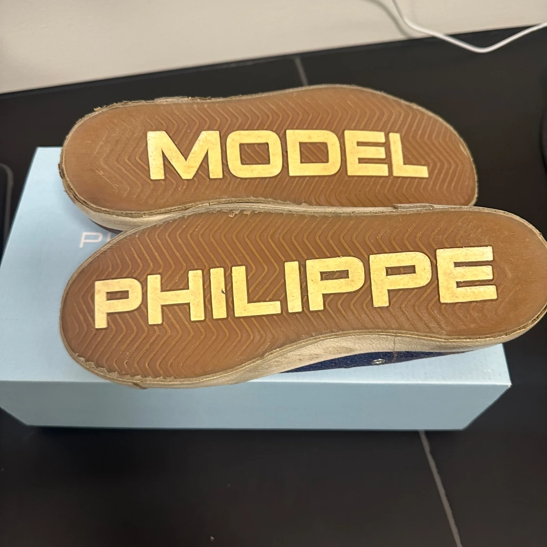 Snygga sneakers i blått och brunt från Philippe Model. Skorna har en unik design med snörning och en distinkt logga på sidan. Perfekta för en avslappnad stil.