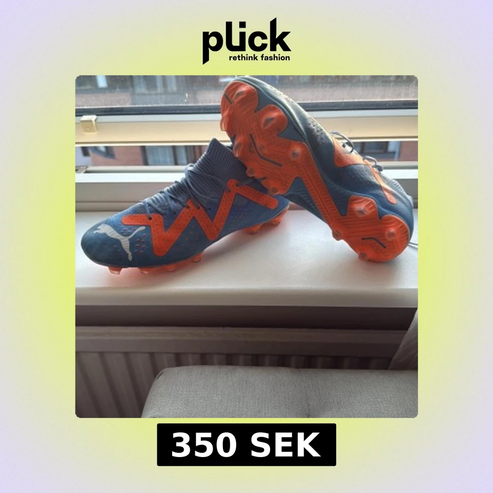 Säljer ett par blå fotbollsskor från Puma med orangea detaljer och snörning. Skorna har en stickad strumpliknande öppning och är designade för bra grepp på planen. Perfekta för dig som vill sticka ut på matchen! Använda kanske 5-6 gånger eftersom dom var för små