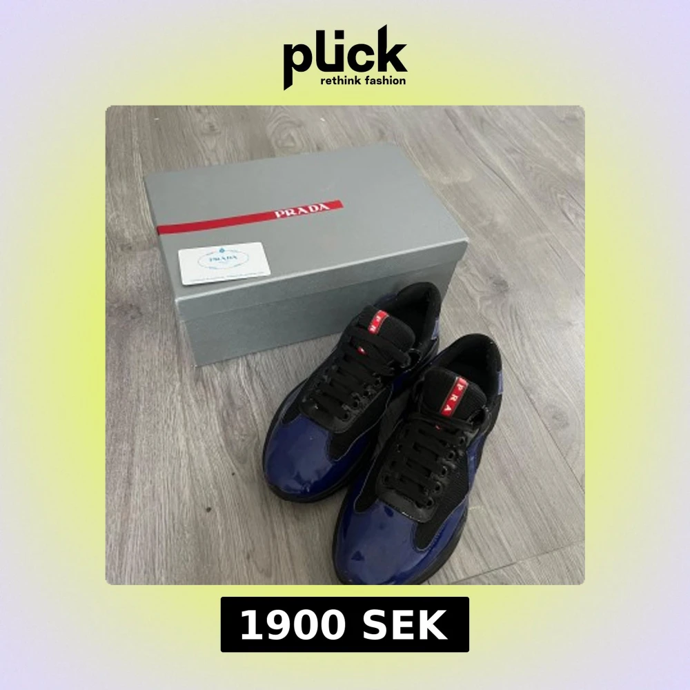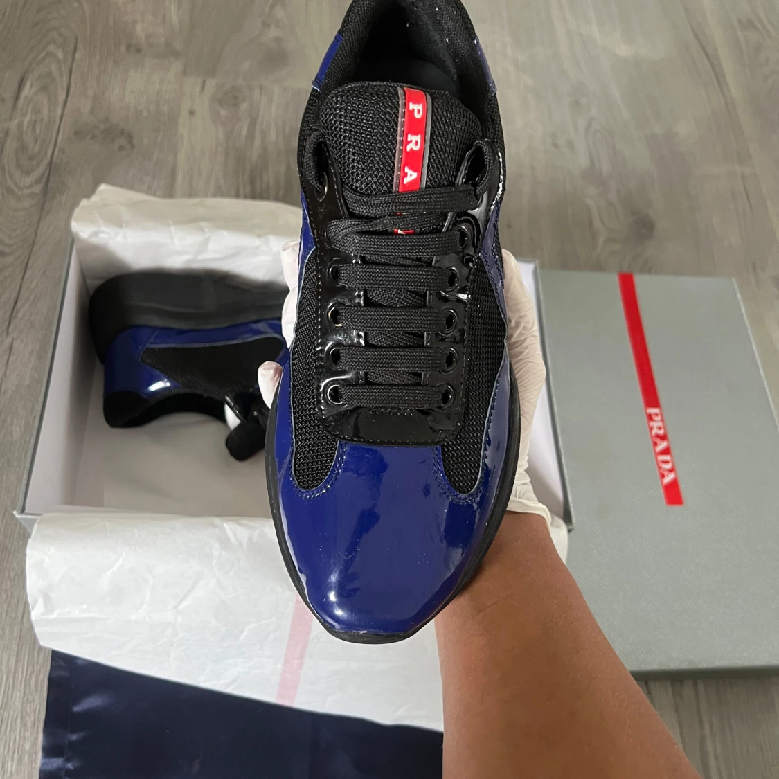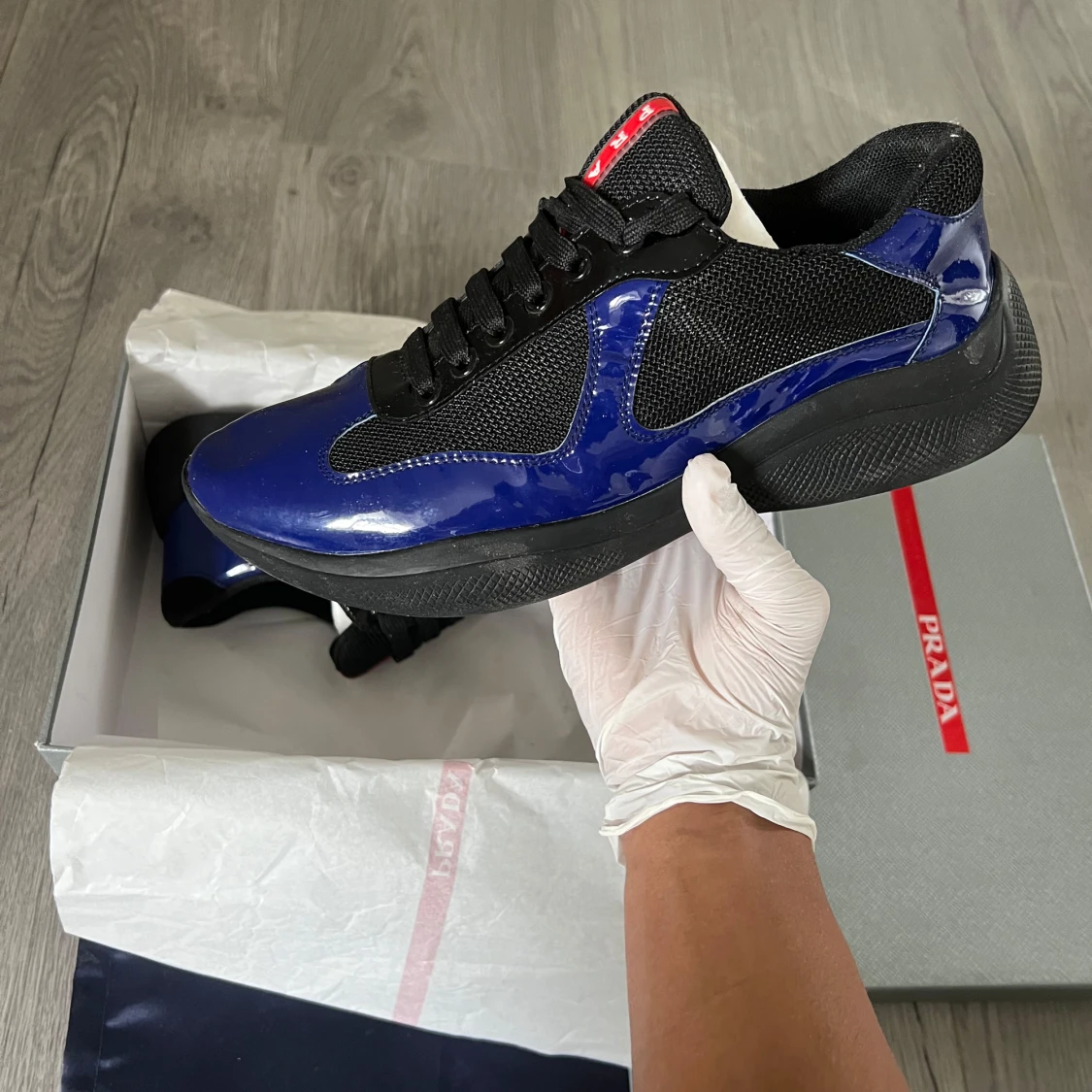 Snygga Prada Cups i blått och svart med glansiga paneler och meshdetaljer. Skorna har svart snörning, rund tå och en chunky svart sula. Röd Prada-logga på plösen ger en exklusiv touch. Perfekta för dig som gillar statement-sneakers.