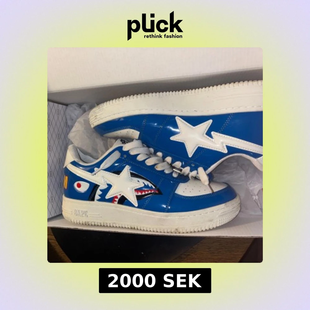 Snygga Bape sneakers i blått och vitt med ikonisk stjärndetalj och hajmönster på sidan. Skorna har snörning och en robust sula, perfekt för en streetwear-look.