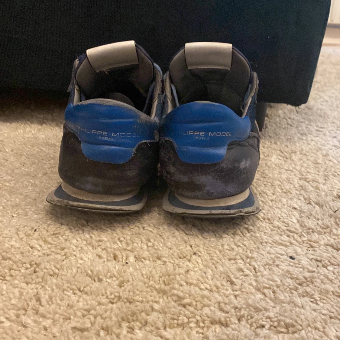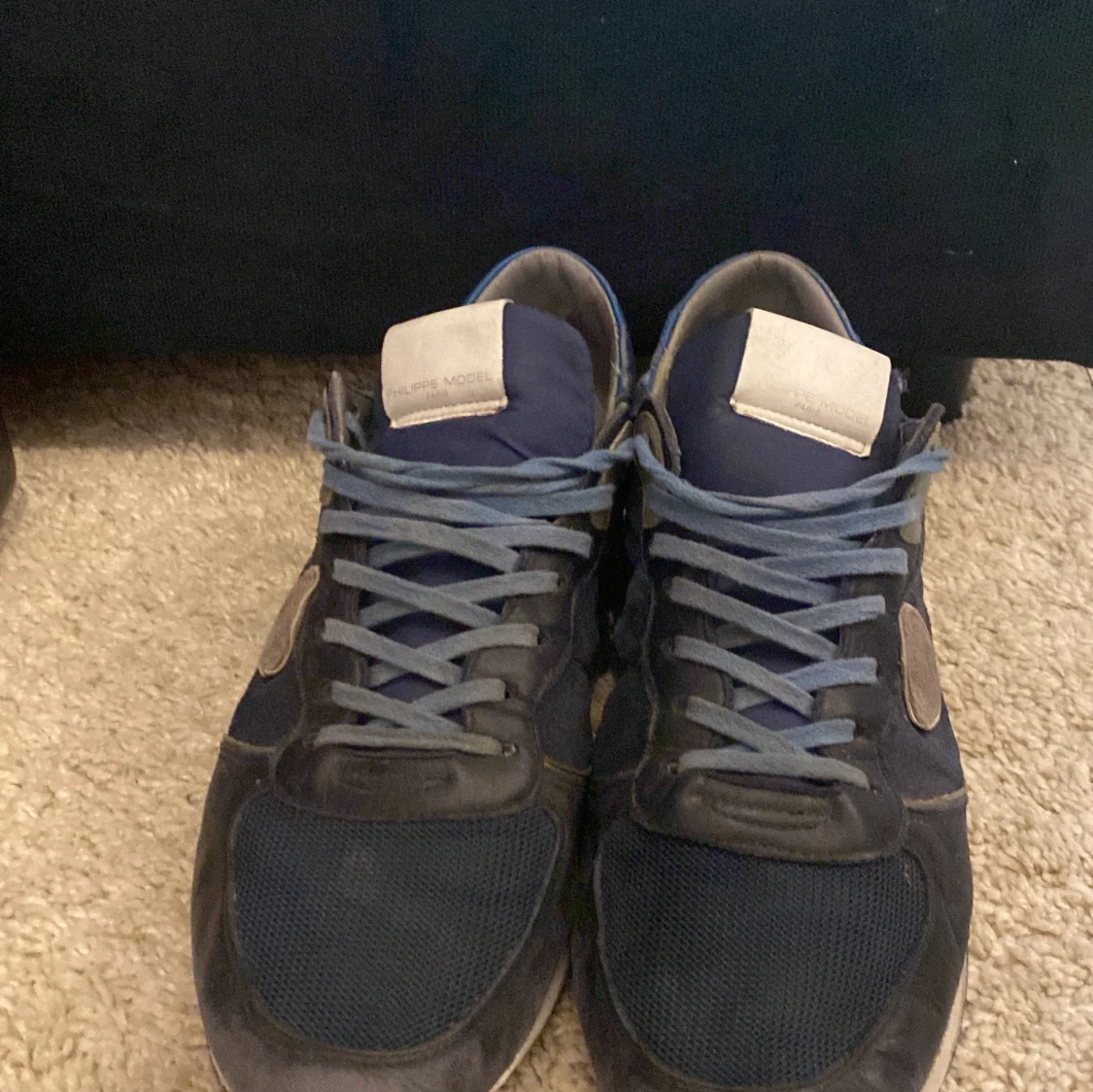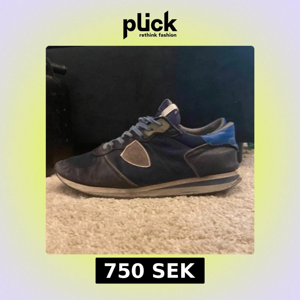 Säljer ett par snygga Philippe Model sneakers i mörkblått med ljusblå detaljer och grå inslag. Skorna har snörning, rund tå och platt sula. Materialmix av skinn och syntet med mesh på ovansidan. Märkeslogga på hälen och sidan. Tveka inte med att höra av dig/ Alex🔥box ingår!