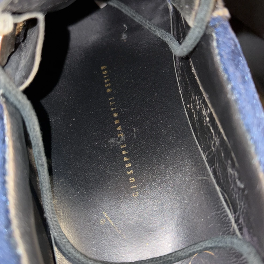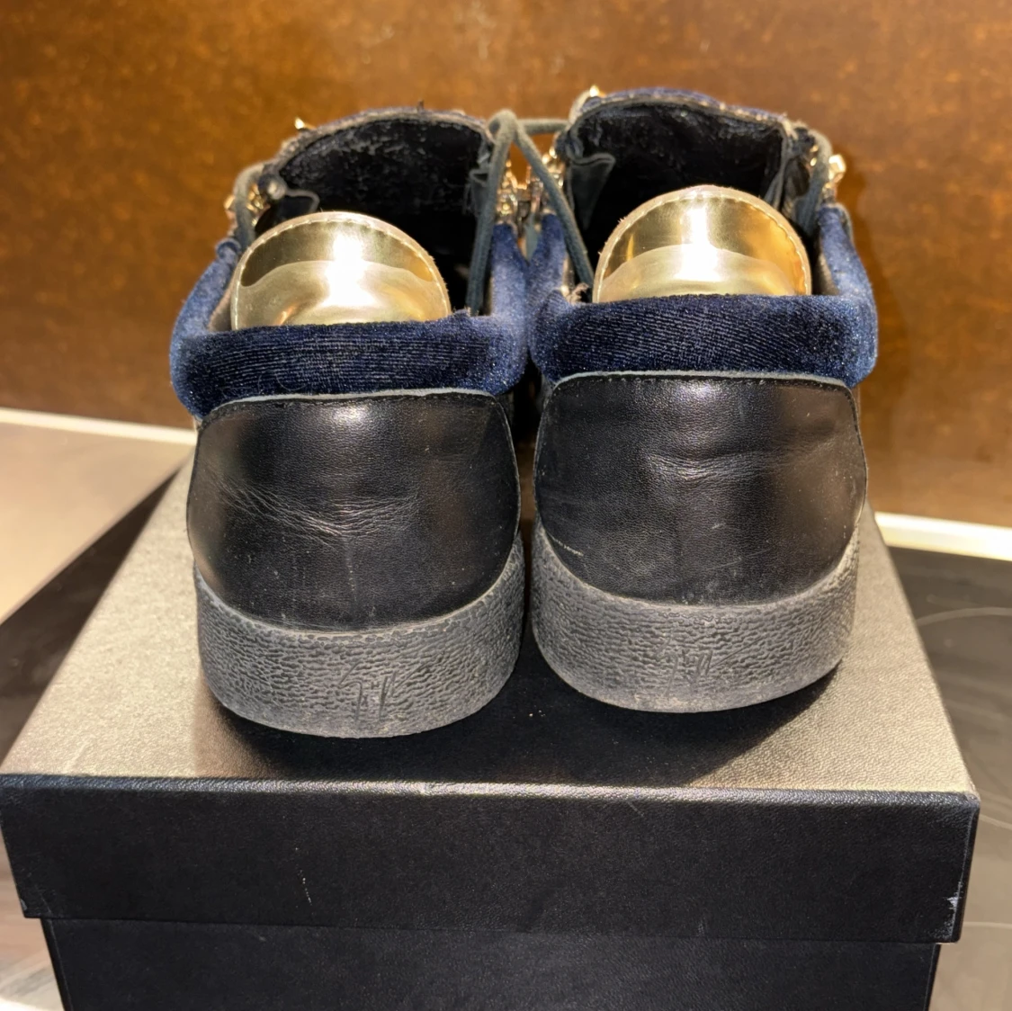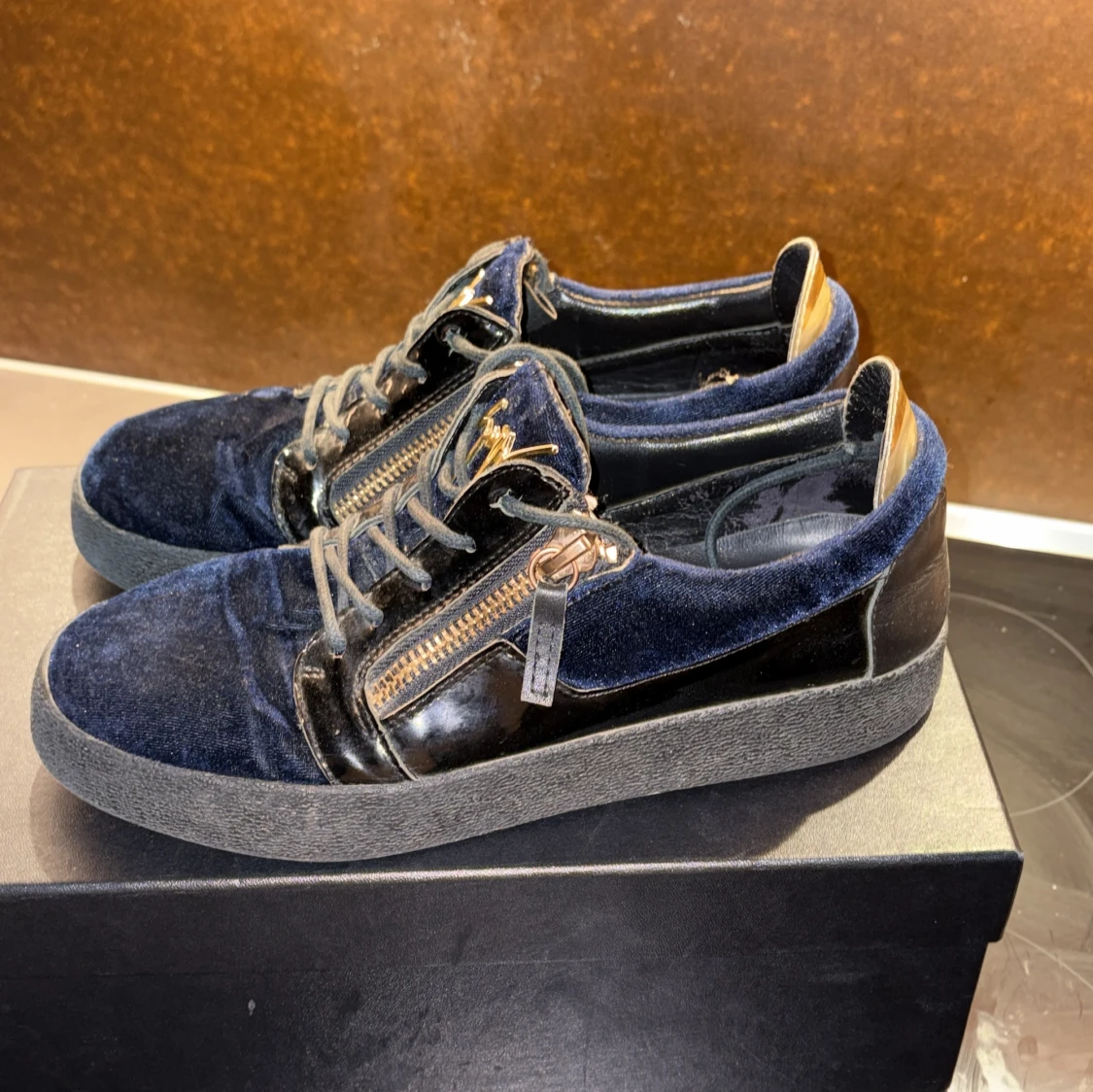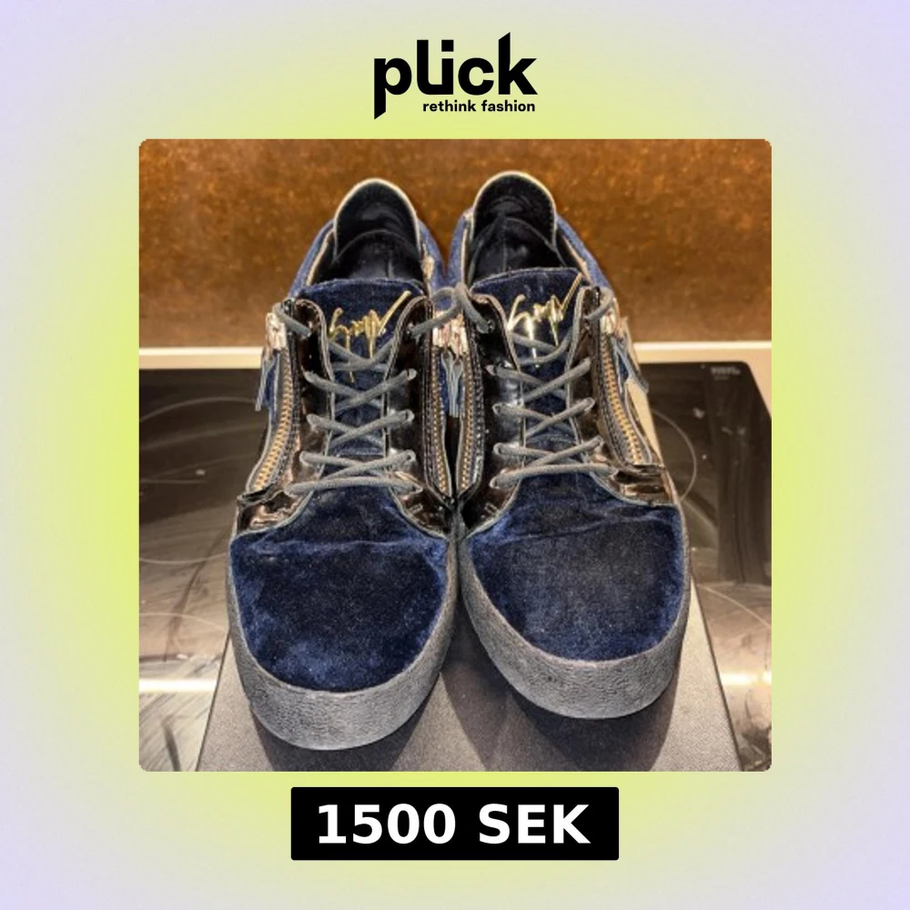 Snygga sneakers i mörkblå sammet och svart skinn från Giuseppe Zanotti. Skorna har guldfärgade dragkedjor på sidorna, snörning och en svart gummisula. Lyxig känsla med coola detaljer och ikonisk logga på plösen.