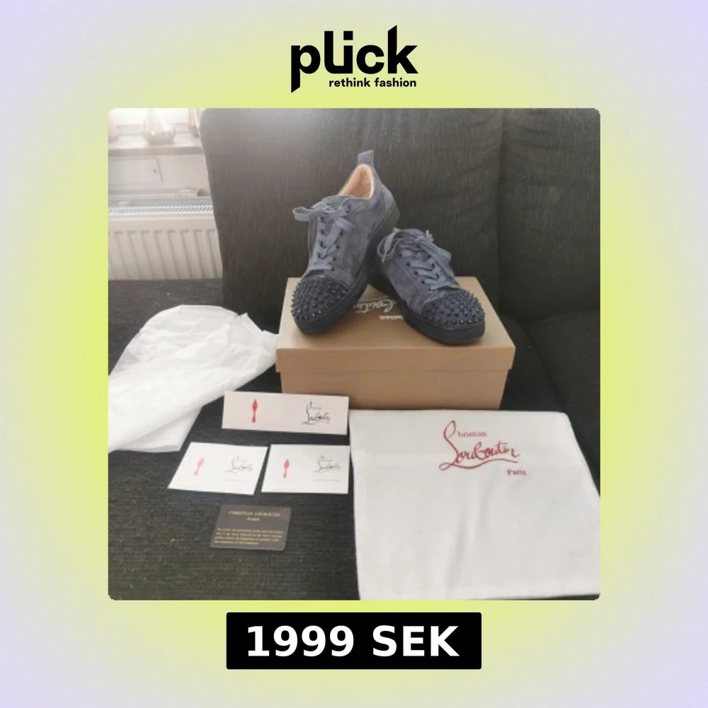 Snygga blå sneakers från Christian Louboutin i mocka med ikoniska röda sulor. Skorna har snörning och är dekorerade med nitar på tån för en edgy look. Perfekta för dig som vill sticka ut med stil. Kom med bud! 😁
