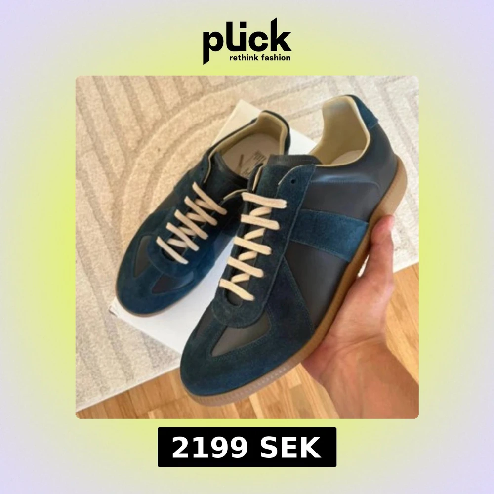 Snygga sneakers från Maison Margiela i mörkblå mocka och skinn med beige snörning och gummisula. Är i helt nytt skick och säljs på grund av lagerrensning, pris kan diskuteras. Kommer med boxen.