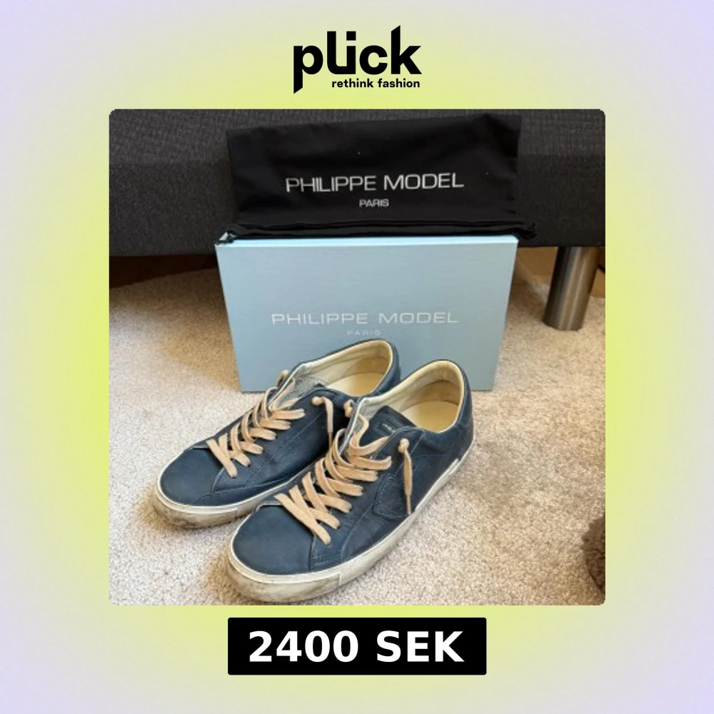 Snygga blå sneakers från Philippe Model med beige snörning och en vit sula. Perfekta för en avslappnad stil med en touch av elegans. Skorna kommer med originalförpackning och påse. Skorna är använda ett fåtal gånger. Köpta för 2 800kr