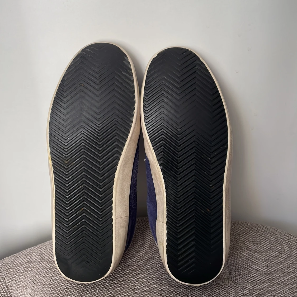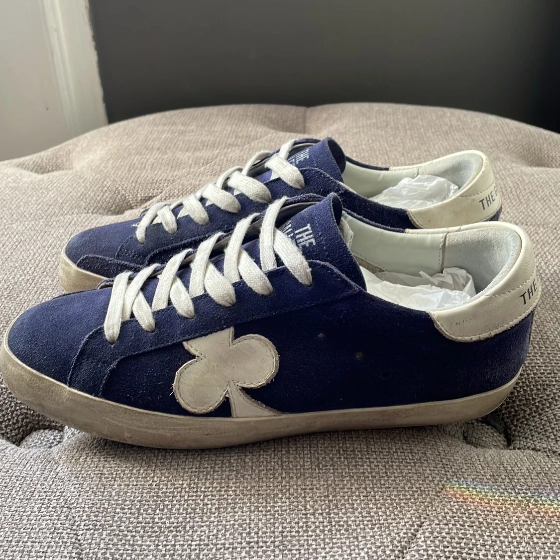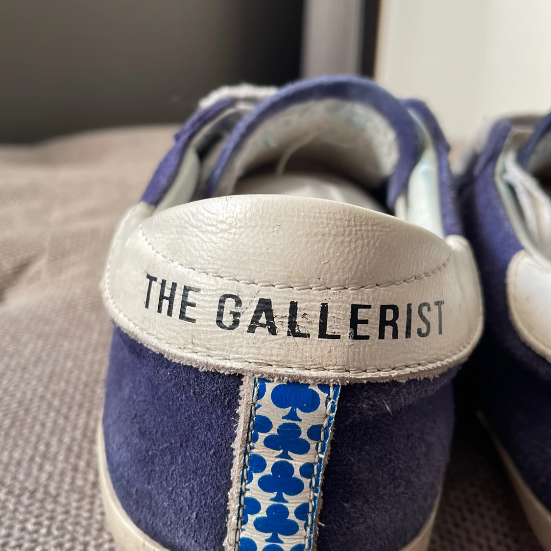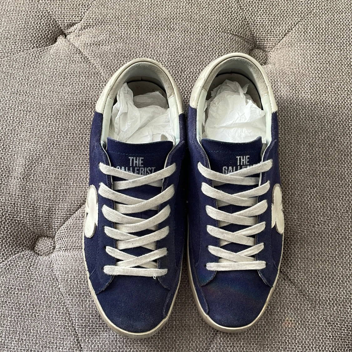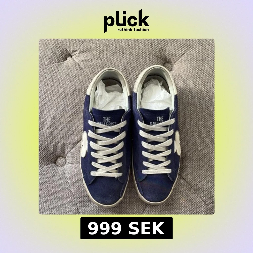 Snygga blå sneakers i mocka från The Gallerist med vita detaljer och snörning. Skorna har en vit klöverdetalj på sidan och vit häl med logga. Kom privat för mer information.