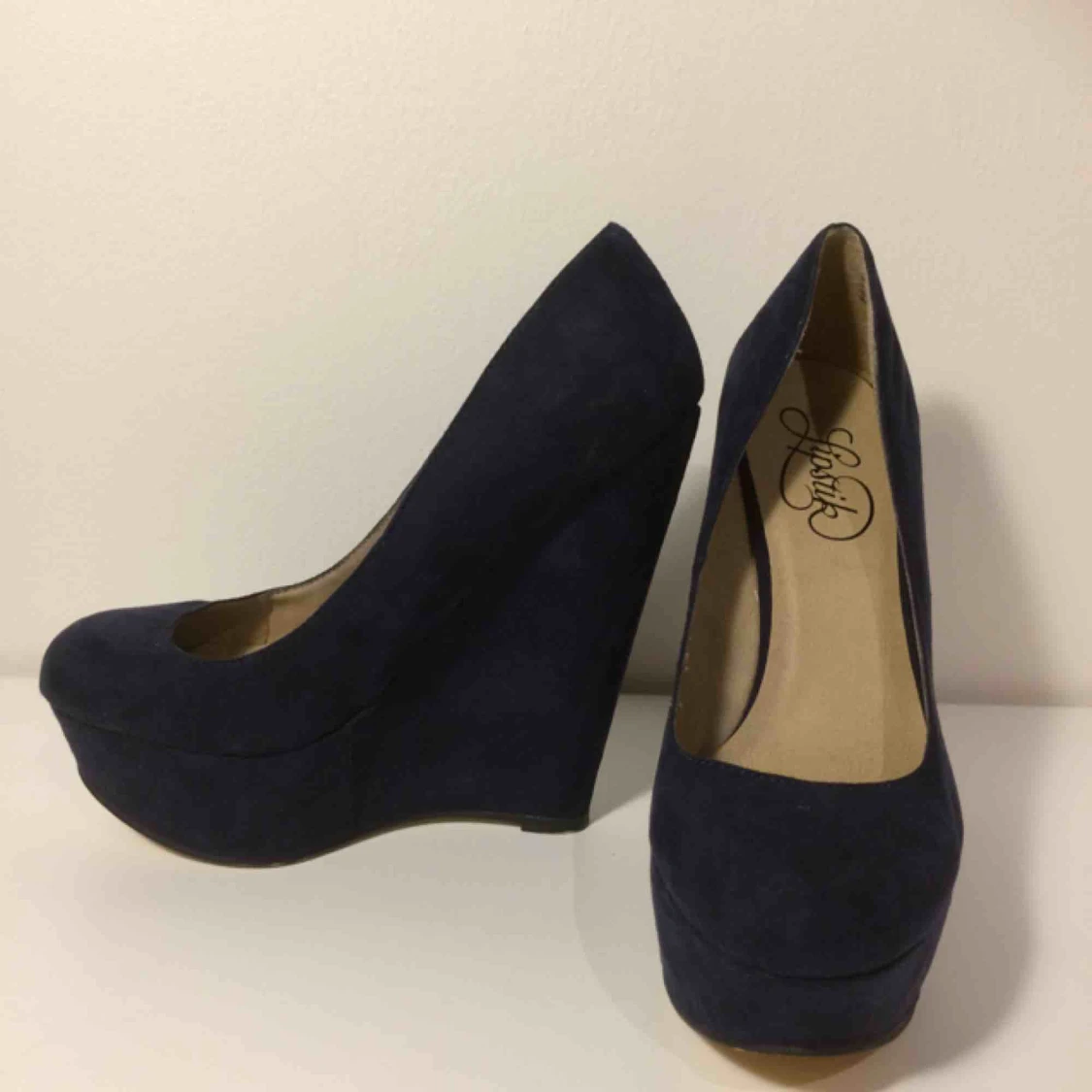 Extremt höga klackskor i mörkblått. Aldrig använda. Frakt tillkommer