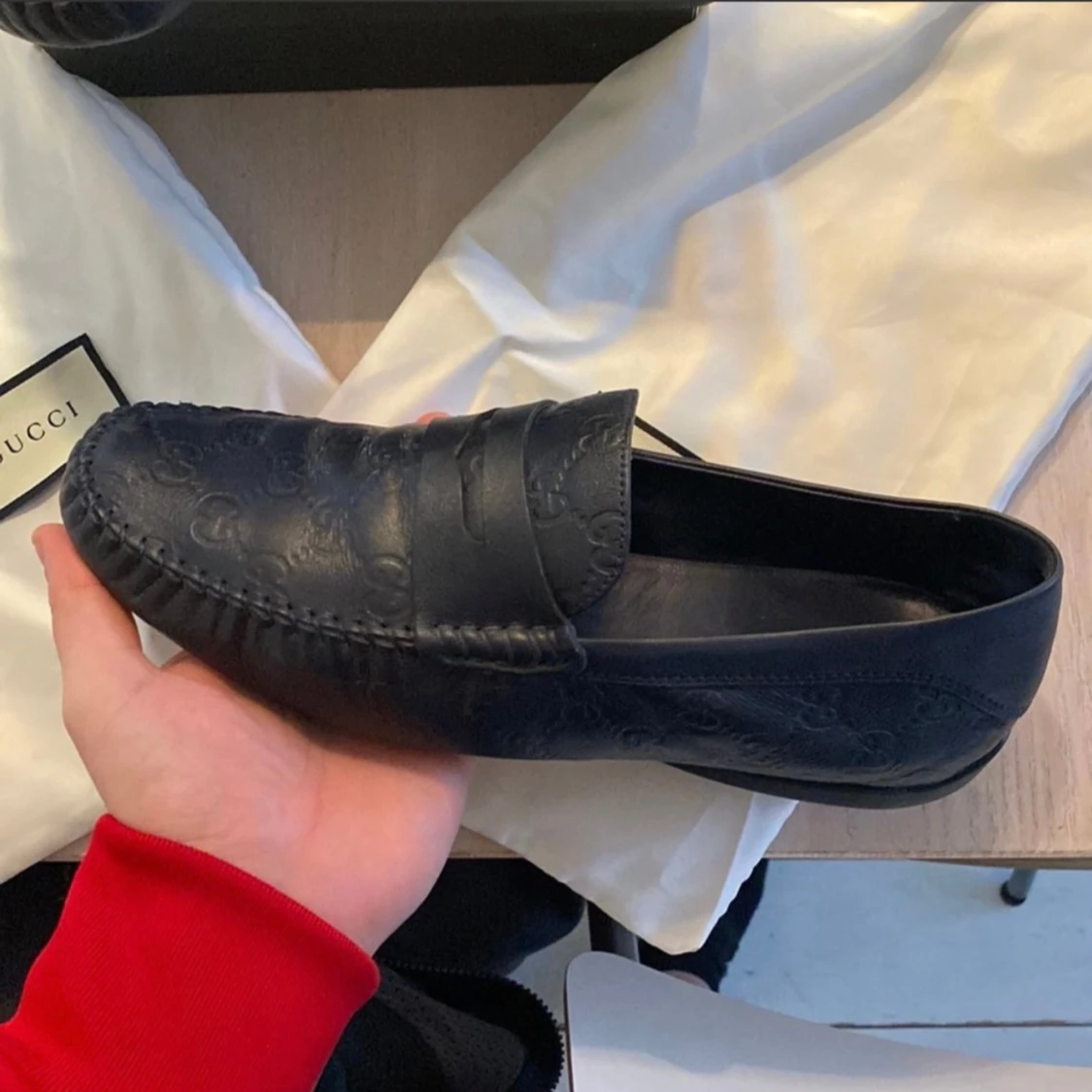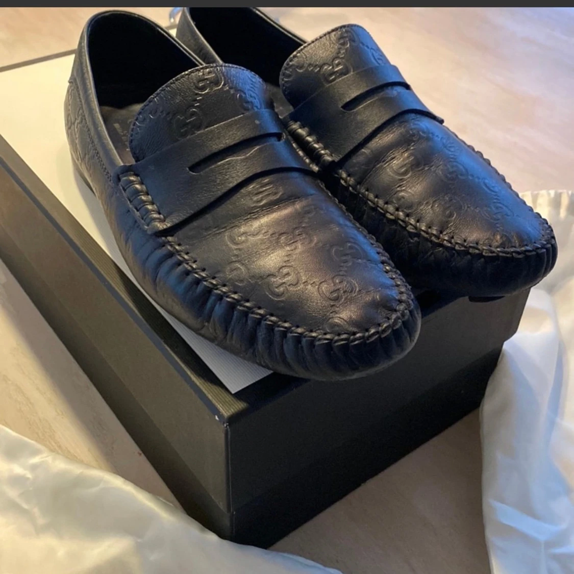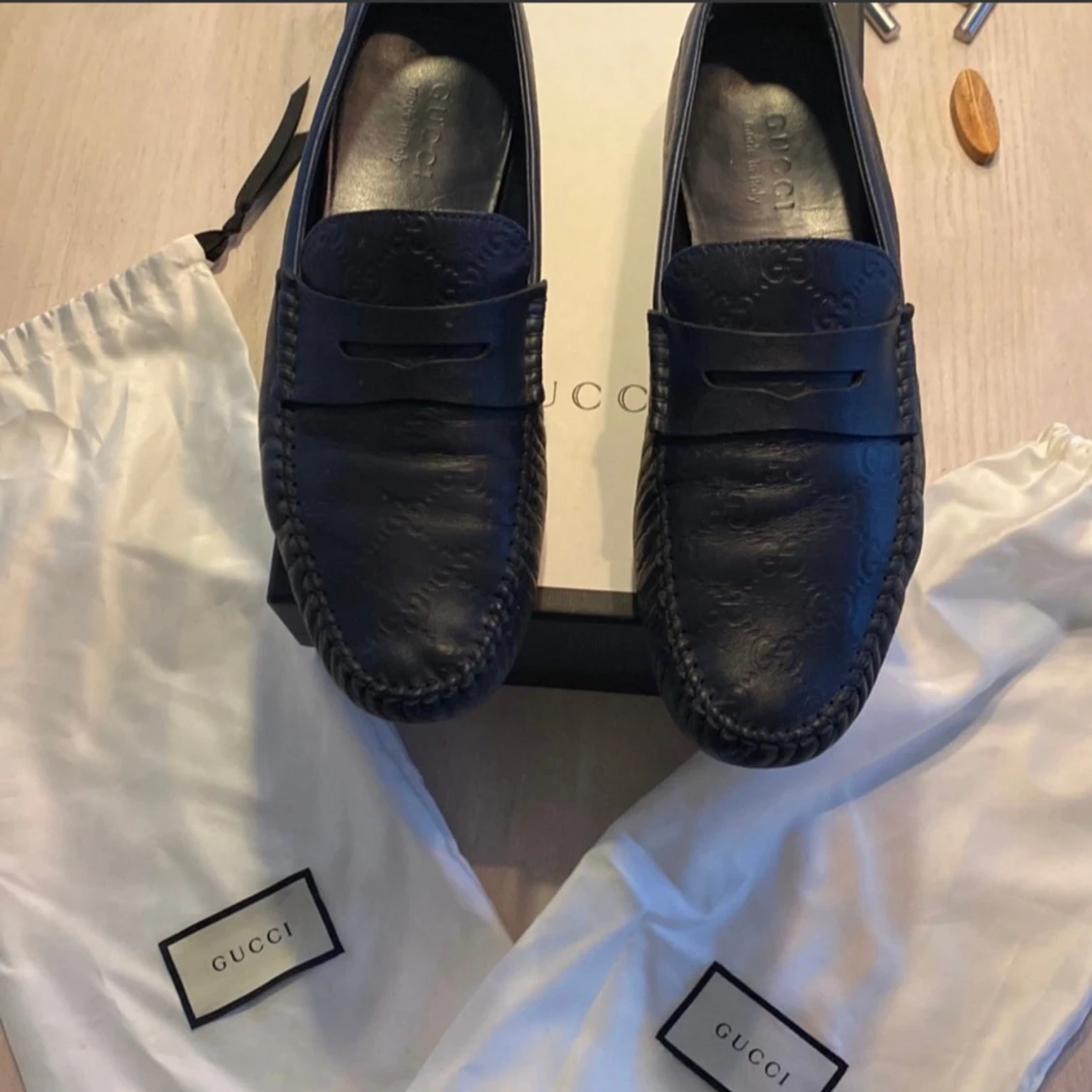 Säljer ett par stilrena blåa loafers från Gucci i skinn. Skorna har ett diskret mönster och är i mycket bra skick. Perfekta för både vardag och fest. Kommer med originalförpackning och dust bags