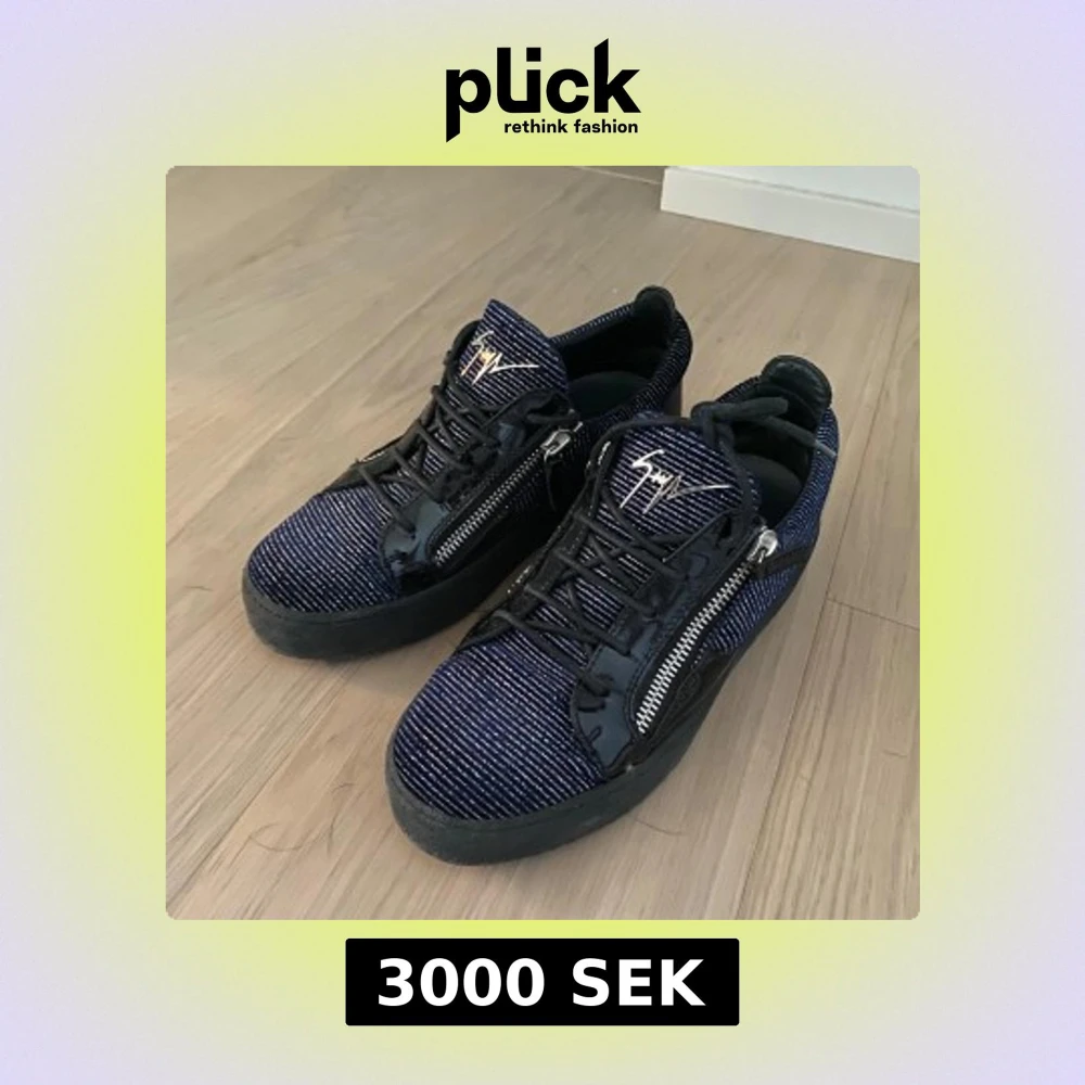 Snygga sneakers i mörkblått tyg med tunna vita ränder och svarta lackdetaljer. Skorna har dragkedjor på sidorna, svarta snören och den ikoniska silvriga Zanotti-loggan på plösen. Perfekt för dig som vill sticka ut med stilrena detaljer. Äkta kvitto finns och box och allt