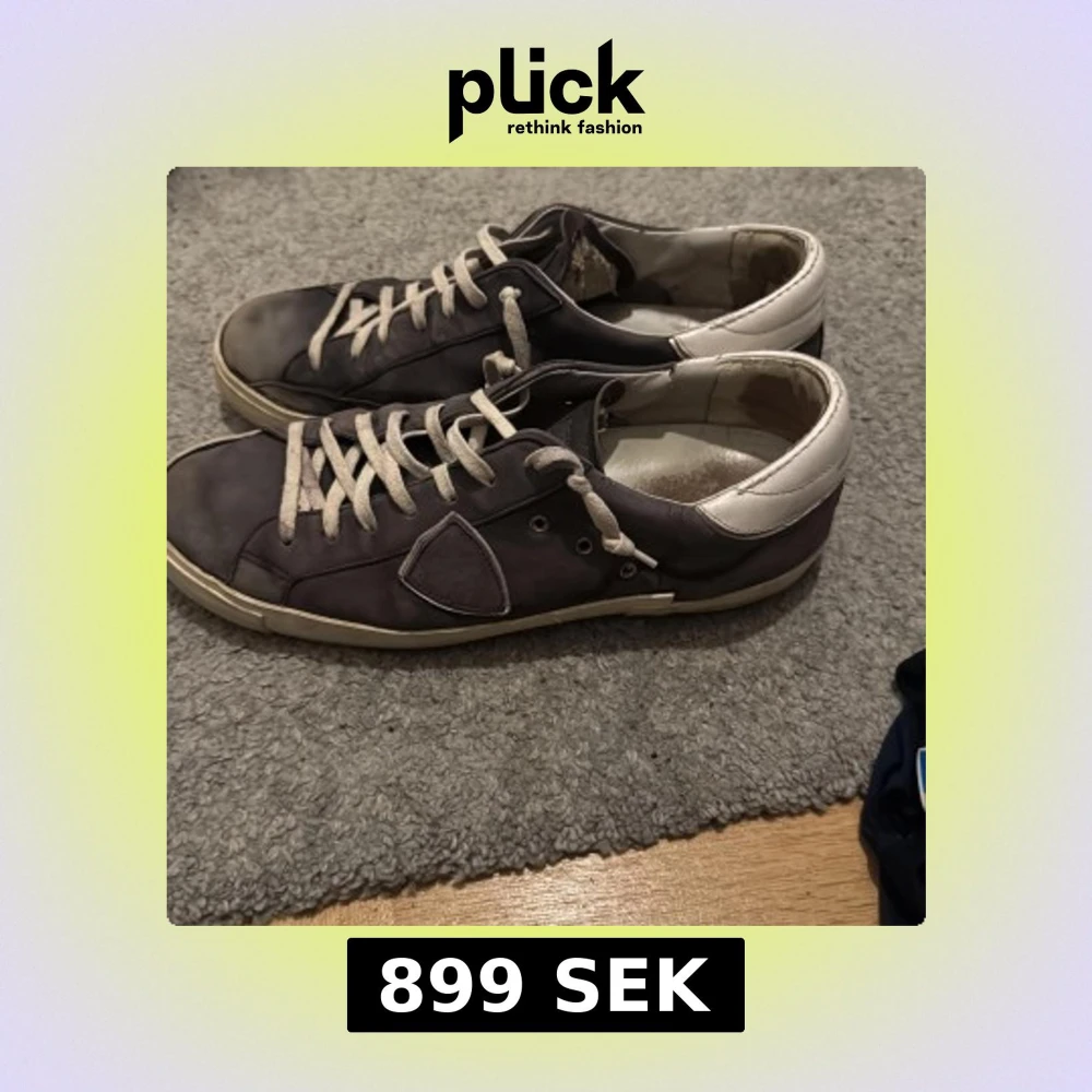 Snygga blåa sneakers från Philippe Model med vita detaljer på hälen och vita snören. Skorna har en klassisk låg profil, rund tå och platt sula. Materialet är skinn och textil, med en ikonisk sköld på sidan. Perfekta för en avslappnad streetstyle-look.