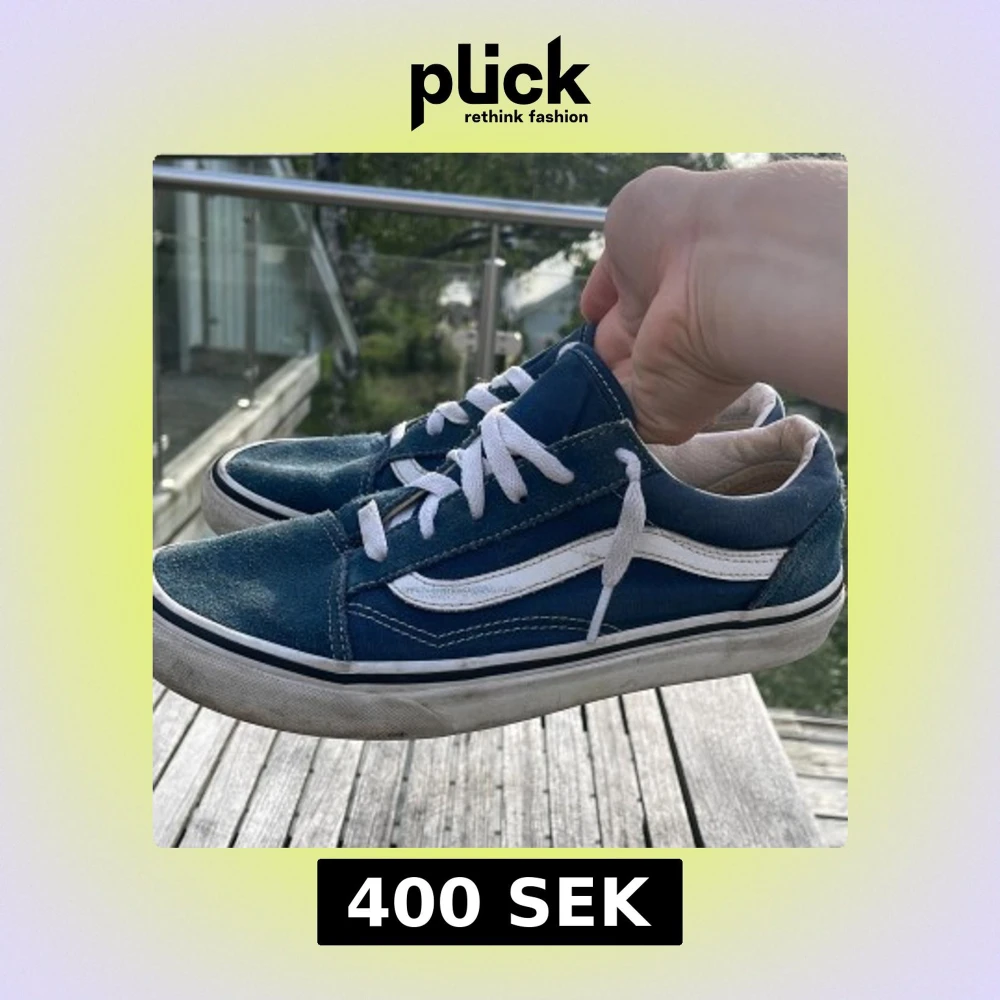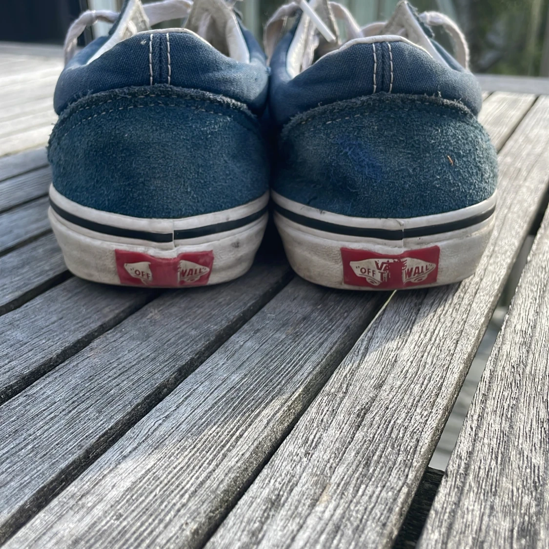 Klassiska Vans Old Skool sneakers i blått med vit sidorand och vita snören. Skorna har låg profil, rund tå och platt sula. Ovandelen är i canvas och mocka, med den ikoniska röda 'Off the Wall'-loggan bak på sulan.