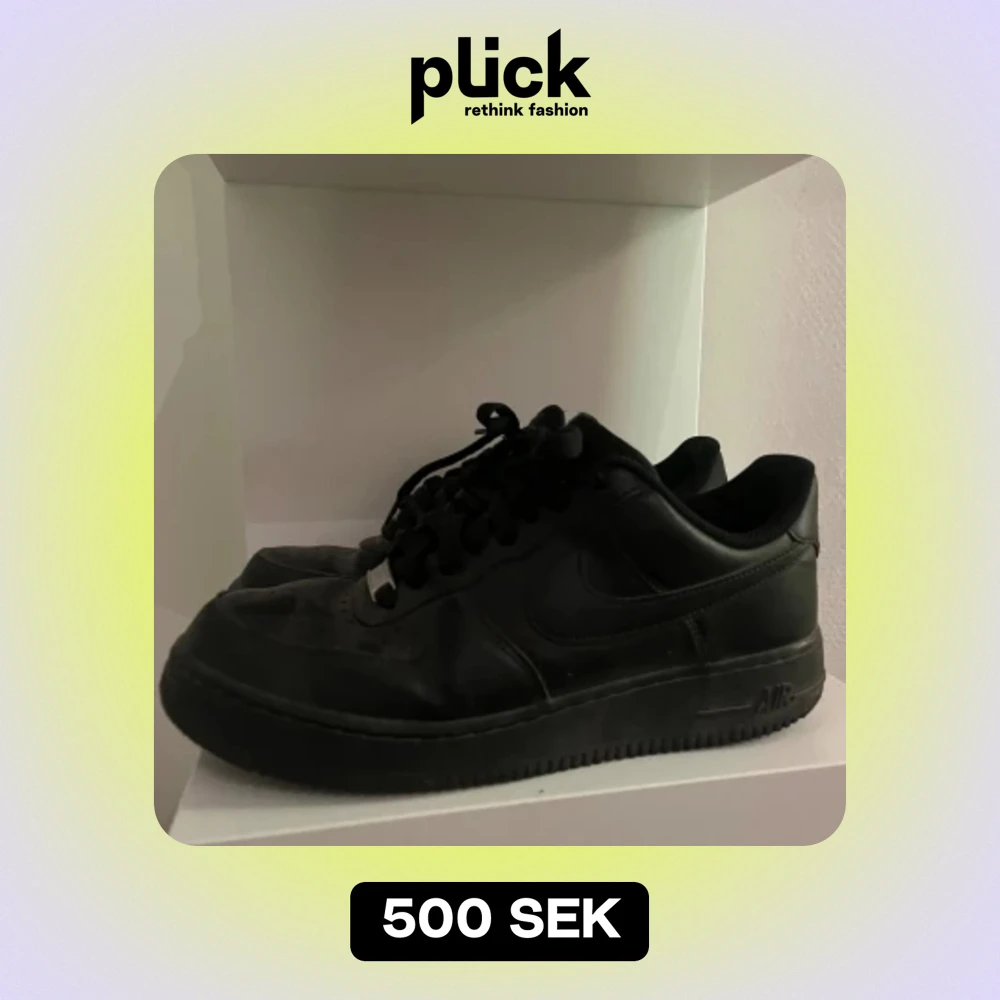 Hej jag säljer mina black af1 för 500kr. Storlek 41. 6/10 i skick, de fungerar utmärkt men är creasade. De är smutsiga på bilden men kan tvätta innan jag fraktar eller möts upp.