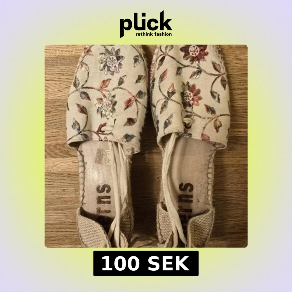 Säljer ett par espadrillos med blommigt broderi i flera färger på beige tyg. Skorna har platåsula i flätad jute och knytband runt ankeln. Perfekta för sommaren och ger en bohemisk känsla till outfiten.
