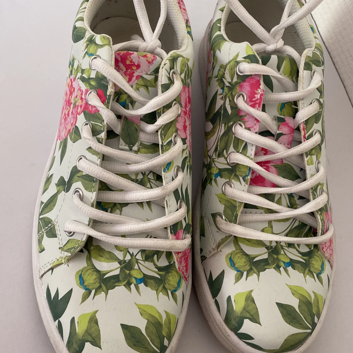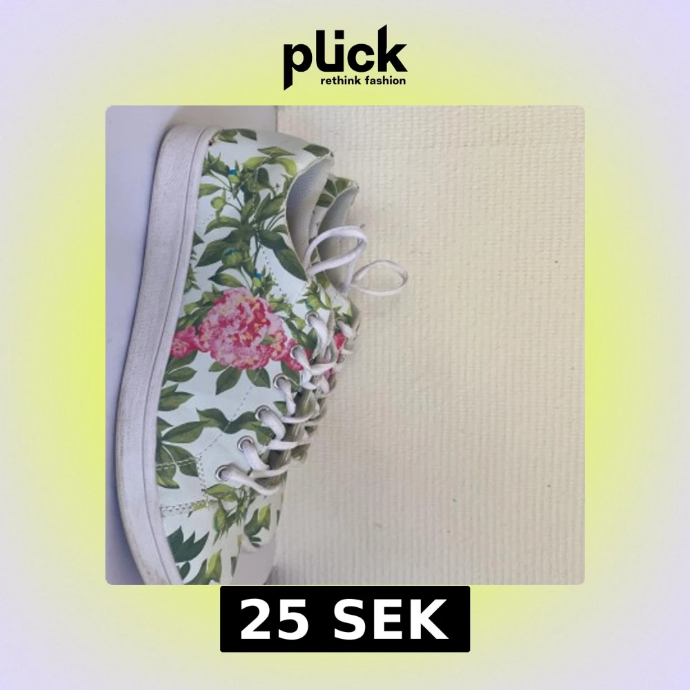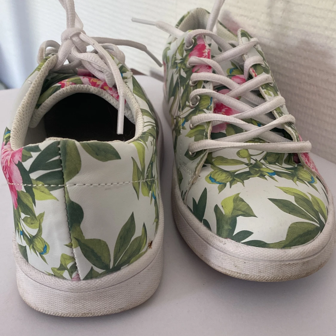 Snygga vita sneakers med färgglatt blommönster i grönt och rosa. Skorna har klassisk rund tå, vita snören och platt sula. Perfekta för dig som vill sticka ut med en fräsch och somrig outfit . De är riktigt lätta att matcha till olika outfits.
